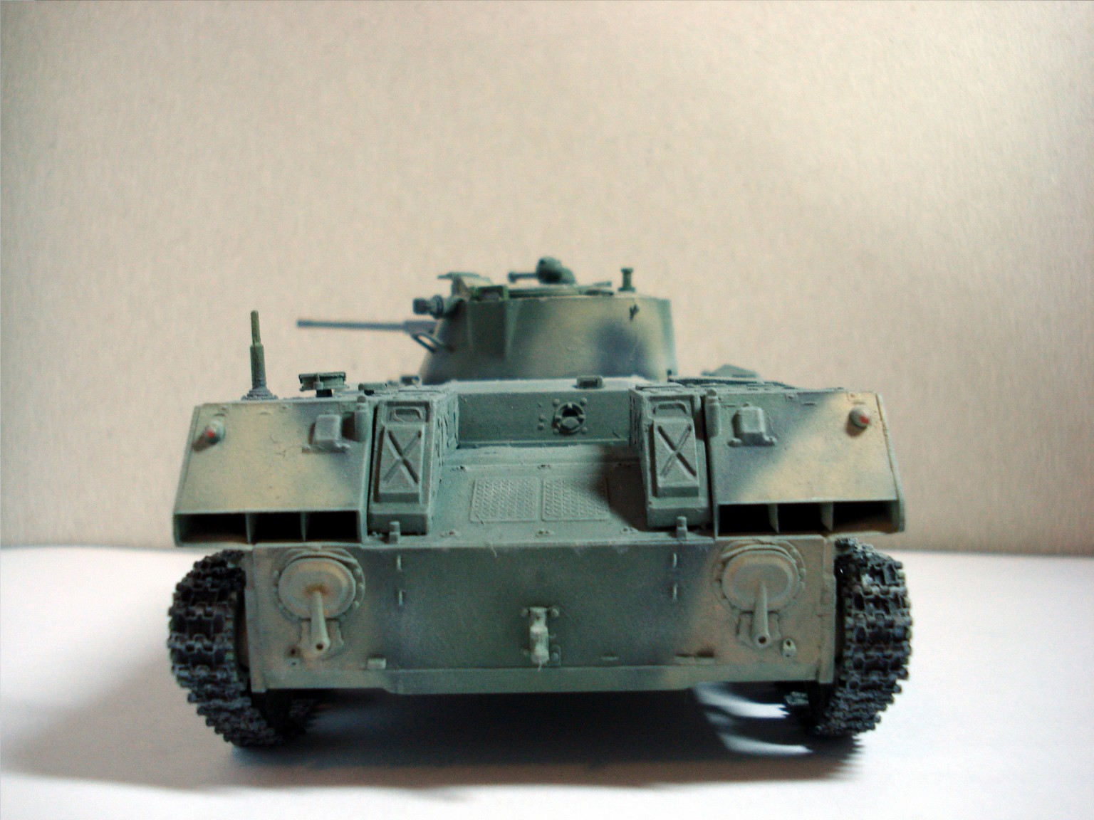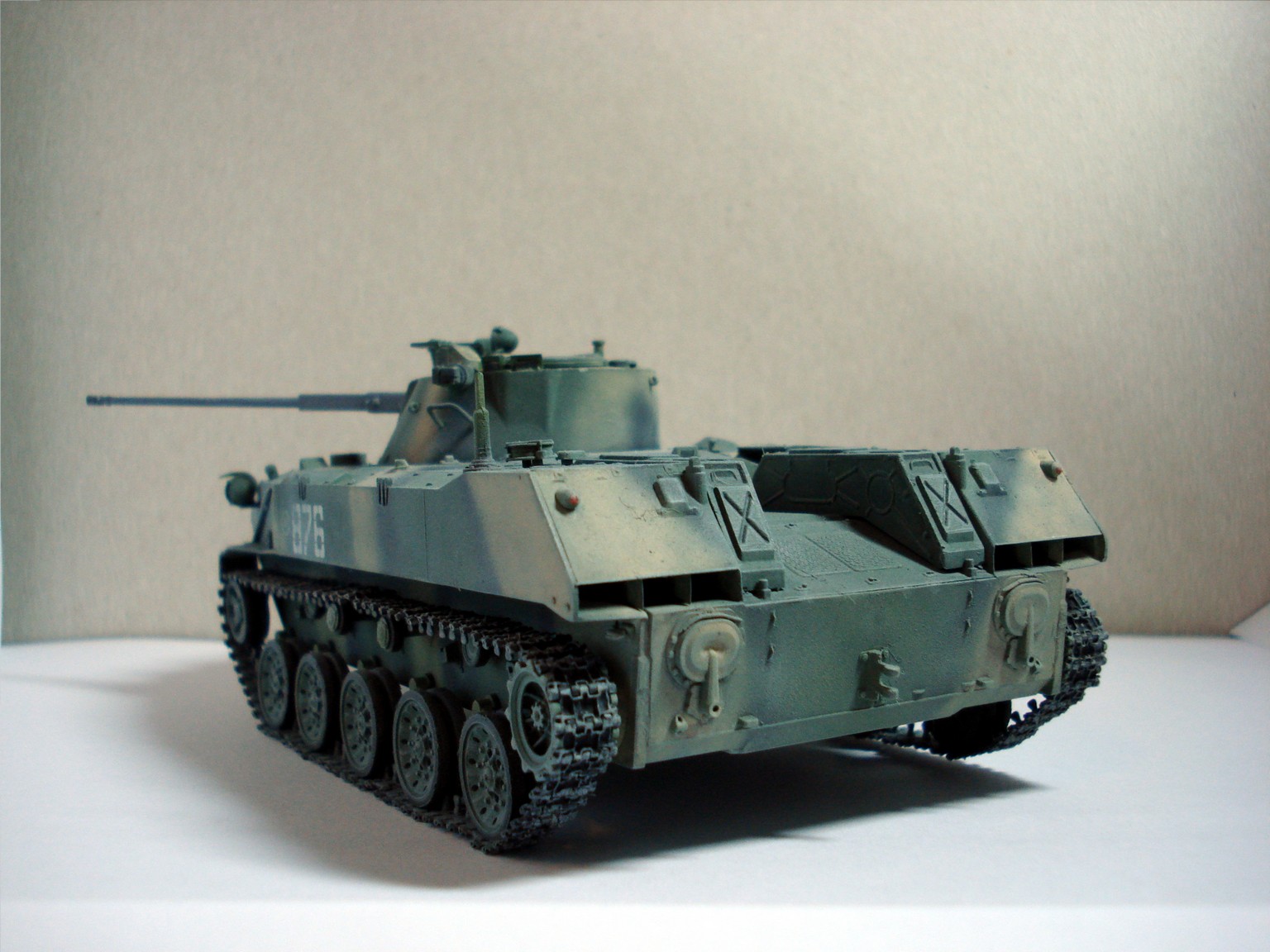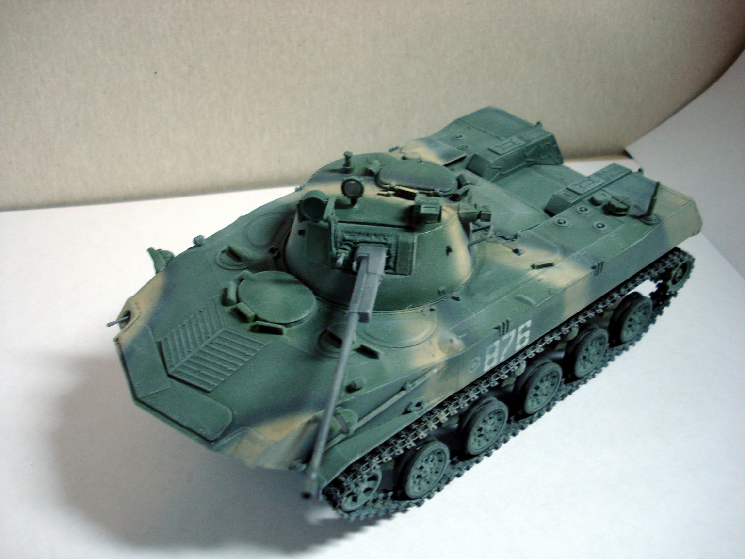 Траки смоляные от MasterClub, под них пришлось допиливать ленивец. И ещё заделал левую амбразуру курсового пулемёта, вот и все доработки. Окраска акрилом Звезда и Тамия по "мотивам". Ну и слегка припылил "пудреницей" от всё той же Тамии.