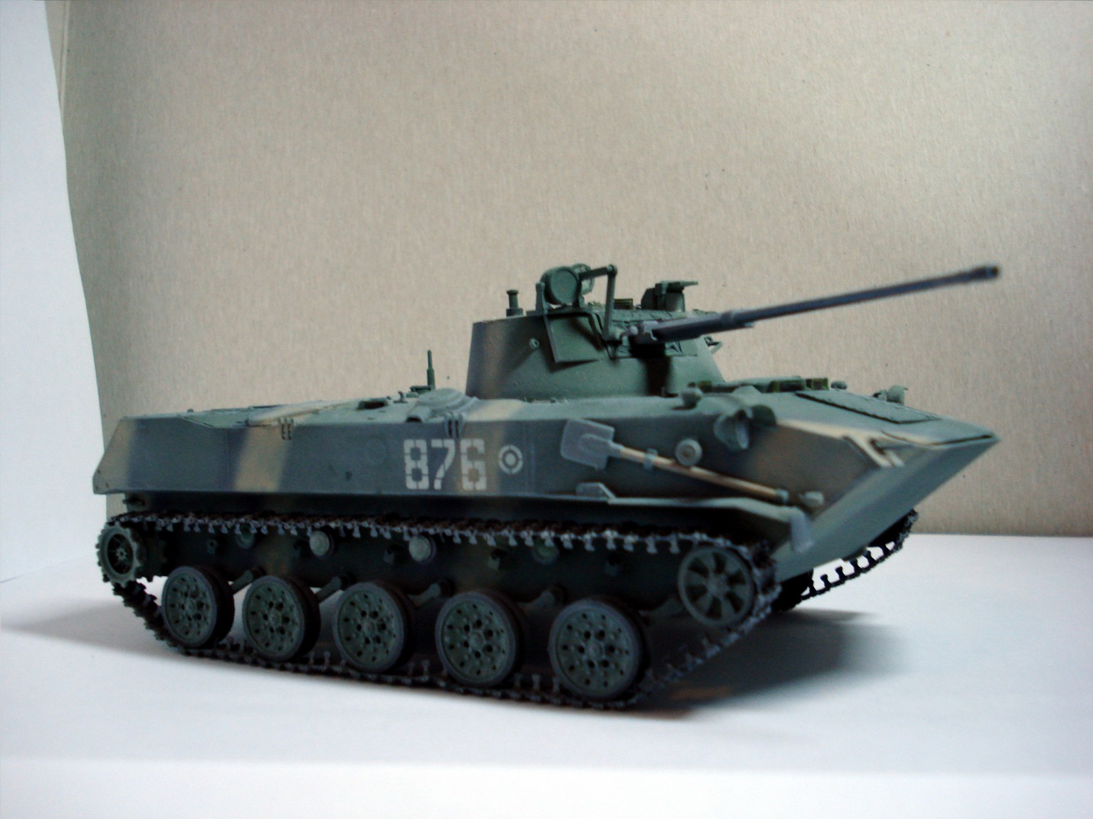 Гусянка по левому борту, по середине слегка вздыбилась и внизу как то странно изогнута, штык у лопаты почему то серого цвета (как будто не крашенный). А так в целом очень не плохо.