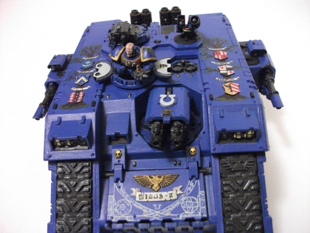 Модель сделана почти полностью из коробки, с использованием совсем незначительных дополнений от других наборов Games Workshop. Были рассверляны стволы тяжёлого болтера и выхлопные трубы. При сборке возникли серьёзные проблемы со стыкуемостью задней части корпуса, что привело к необходимости разборки, перепилке и повторной склейки наполовину готового танка. Даже после этого остались щели, впоследствии закрытые пластичной массой citadel. Красился танк красками Valeho, проливки и высветления производились смешанными или разведёнными красками этой же фирмы. После этого вся модель была покрыта матовым лаком также от Valeho. Пигменты - ржавчина Миг на выхлопных трубах. Декали оригинальные, имевшиеся в наборе.