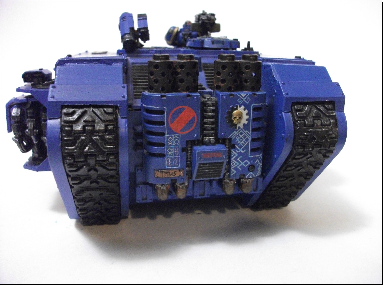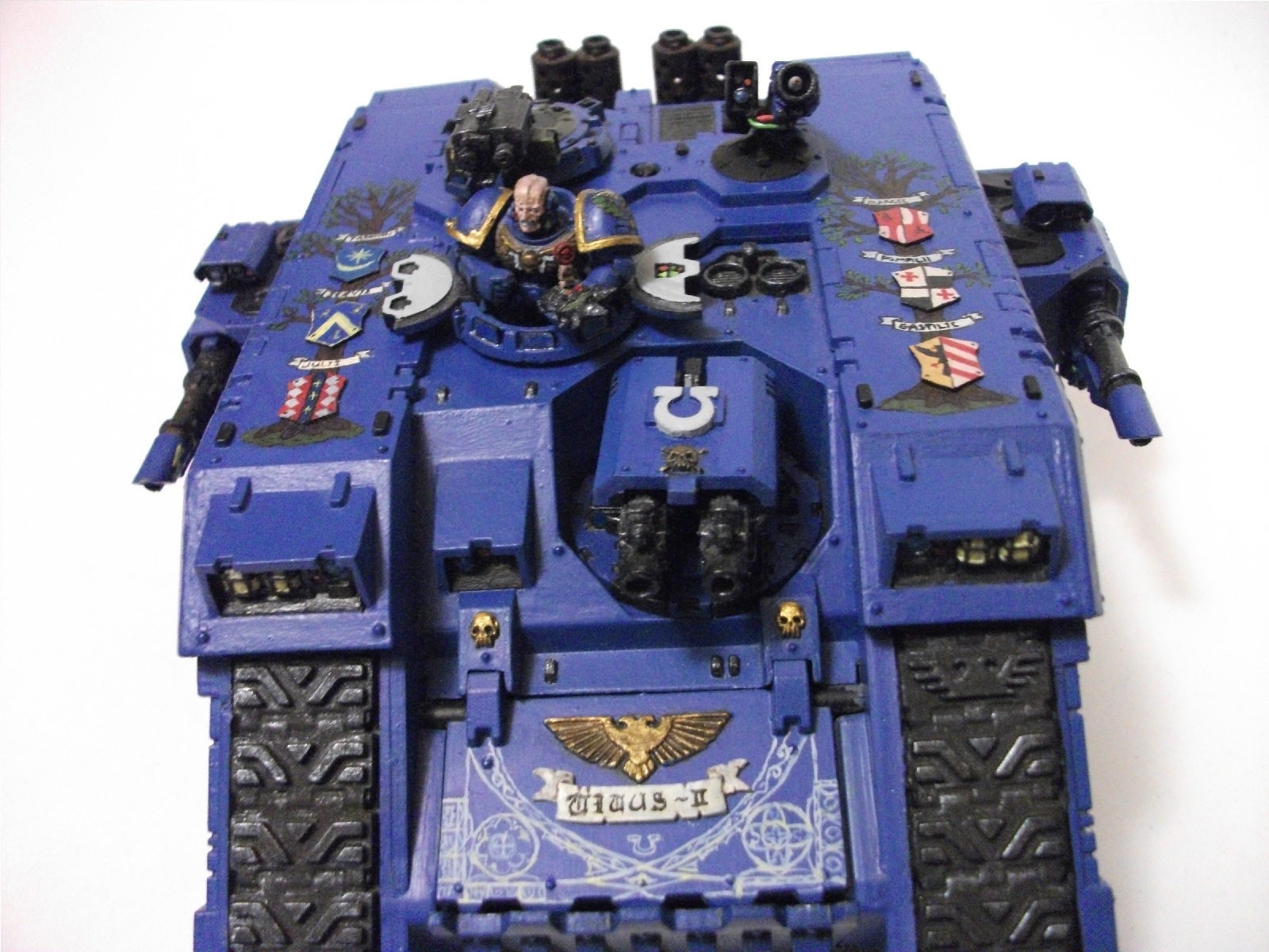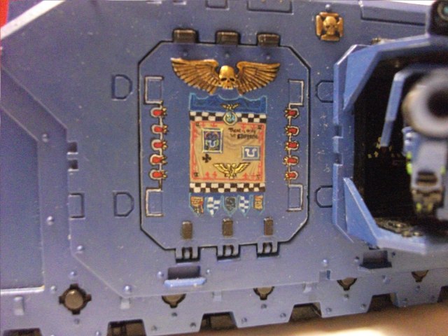 В ближайшее время постараюсь добавить более контрастных высветлений и затемнений и перекрасить левый сегмент кормы, добавить оставшиеся символы и обозначения из кодекса на машину, но флаг, щиты и орнамент беку вроде соответствуют. Их прототипы взяты из скринов игры warhammer 40000 firestorm http://forums.warforge.ru/lofiversion/index.php?t28819-2250.html
