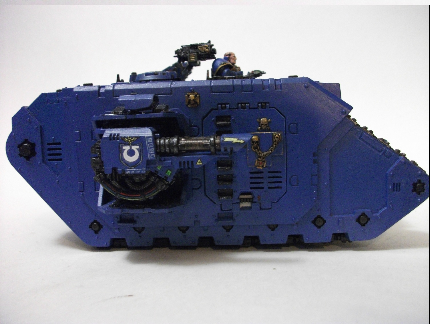 Представляю свой Land raider космического десанта ордена Ультрамаринов. Модель делалась по мотивам транспорта техножрецов ультраамара из игры Warhammer 40000 dawn of war whinter assault. Отсюда несколько нестандартная окраска в сравнении с традиционной геральдикой ордена. Так как танк отображает элитную часть ордена, он собирался со всеми возможными дополнениями, однако в целом он соответствует стандартному ленд райдеру из соответствующего кодекса.