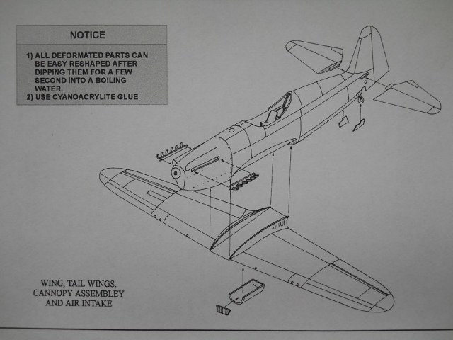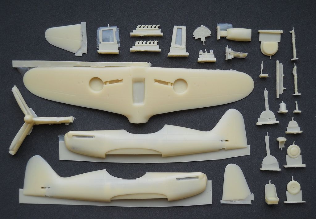 Модель из смолы от фирмы Choroszy Modelbud в масштабе 1/72 (номер по каталогу A55) упакована в картонную коробку. Традиционное для этой фирмы тонкостенное литьё половинок фюзеляжа с обильной деталировкой. Практически все детали отлиты весьма неплохо. Порадовала подробная имитация интерьера кабины. Приборная доска проработана с двух сторон! Ваку-фонарь прозрачен, но имеет «песочек» по поверхности. Декали даются на не существовавший вариант окраски. Инструкция весьма подробна и наглядна.