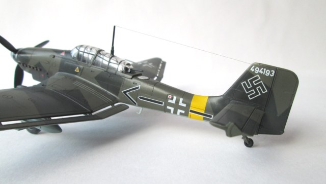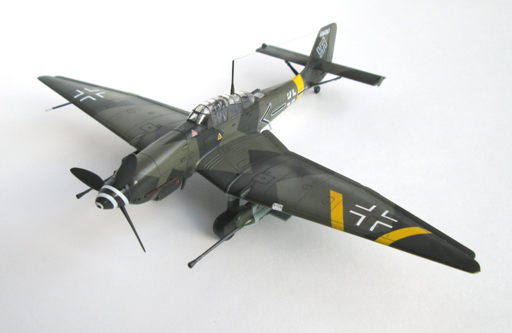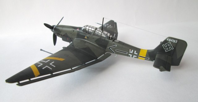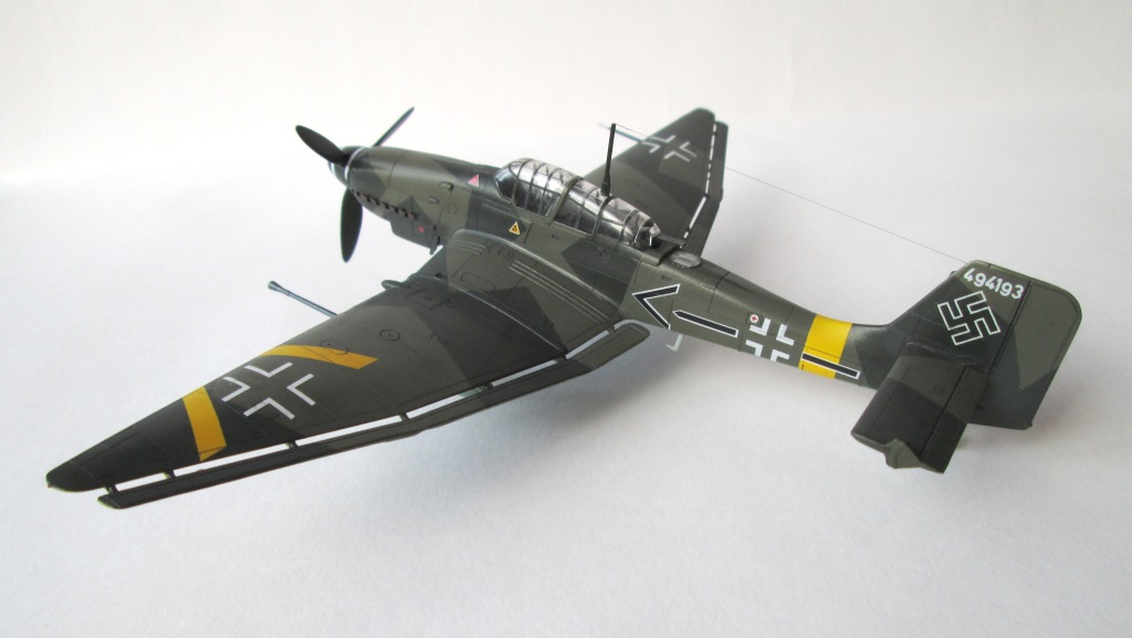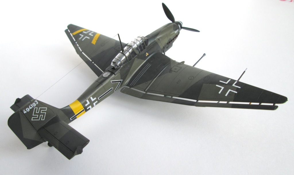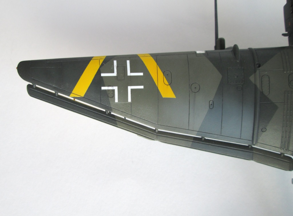 Свастика должна быть стандартная, черно-белая, а не в виде белой окантовки,я сам такую ошибку сделал на своем Юнкерсе.А желтые полосы в виде шеврона на крыле наносились на самолеты, воевавшие 44-45г. в Венгрии.
