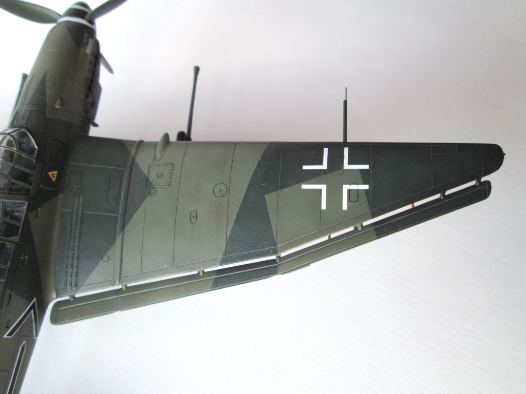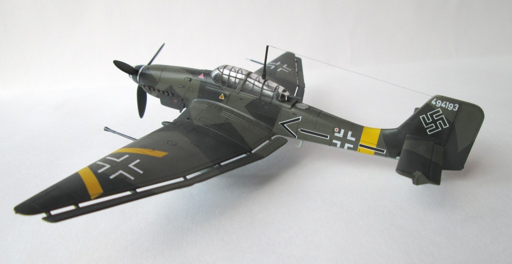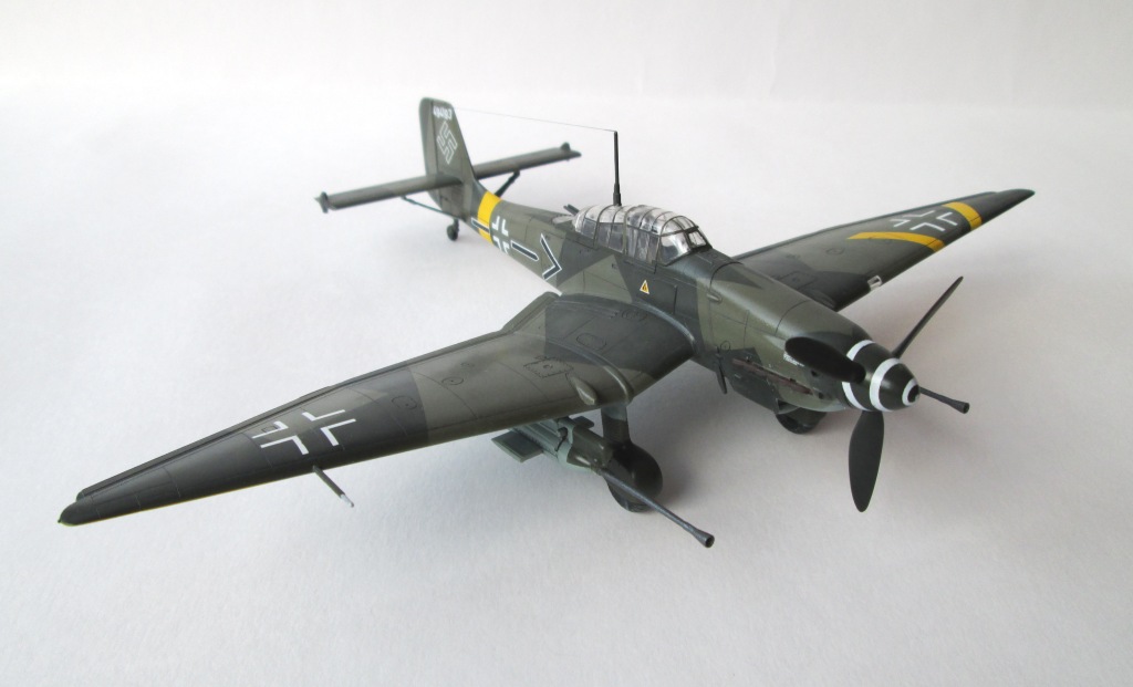 По крестам на крыльях я тоже так до конца и не выяснил. Сверху - параллельно оси самолёта. Так и рекомендуют схемы RLM.Они соблюдались. А вот снизу рекомендации не выполнялись( или были ещё другие). Я нашёл только расположение вдоль оси самолёта. Но судя по фото, кресты снизу могли быть вдоль, угол отрицательный и даже положительный. И кроме этого они могли смещаться от центра к передней кромке . По развороту крестов снизу есть только стандартная схема для Не-111. А на своём Ю-87 я сначала сделал по инструкции, но это был сильный угол. Потом я его немного уменьшил, как на фото .Кстати, на самолёте Руделя №494193 кресты были развёрнуты, а на самолёте №494110 кресты были параллельны линии полёта.Оба Ю-87 Г-2