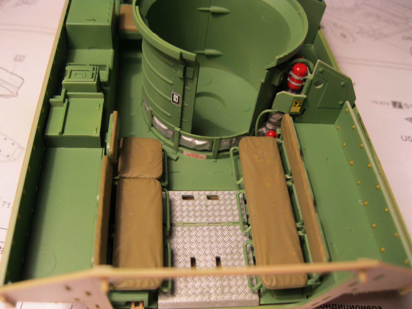 Полный интерьер десантного отделения, боевого отделения и башни, МТО. Полностью рабочая подвеска и траки, все люки открываются.