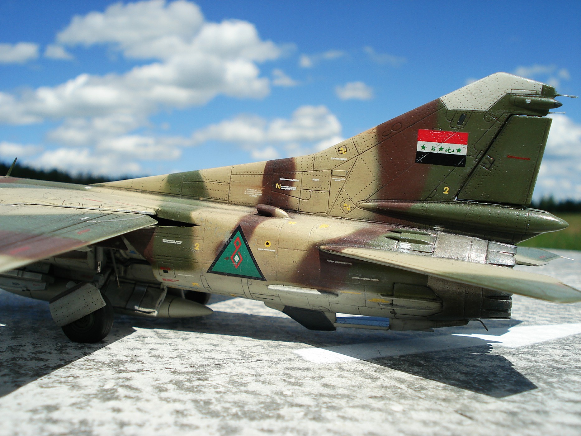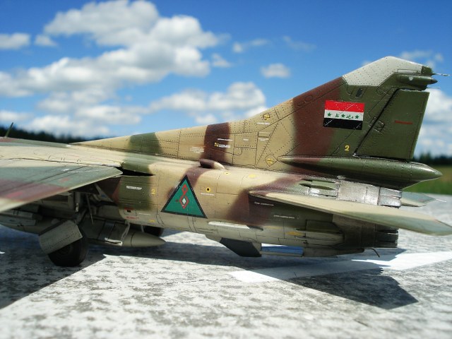 Всем привет! Выставляю очередную поделку на тему: служба авиации Советского производства за рубежом. Строил модель в свободное время, а его практически не было, по этому стройка затянулась на 2 года. Параллельно вел МиГ-23 уб от арт-модела. Работа с данной моделью не доставила удовольствия, скажу честно, но результат лично меня порадовал. Преимущество набора: фототравление, наличие богатого клёпа, коего приходилось восстанавливать процентов на 20 (не много, при аккуратном шпатлевании), тонкая расшивочка порадовала. Из афтера использовал колеса от «Elf» ПВД от «Mastermodels». Доработал гребни в воздухозаборниках, подточил толщину, открыл створки доп. забора воздуха, немного проводки на шасси, гидравлика и пушки из игл, может чего еще, уже не помню. Крылья приклеил наглухо, хотя растачивал фюзеляж под складывающиеся крылья, провисать стали короче, не стал далее заморачиваться. Красил «Аканом» разводил цвета на глаз, песочный собрал из 3 цветов, с горем пополам, базового песочного не было. Смывка акварель. Лак футура и матовый акан. Декали от Арт моделовского уб. В процессе лакирования запорол крылья, пришлось перекрашивать, деки соответственно накрылись, помог Дима Соболь, за что ему отдельное спасибо! Можно было бы конечно по серьезней сделать проводку в нишах и стойки доработать, но как - то без фанатизма, просто довести дело до конца хотелось. А-то глядишь и командировка нарисуется. По фото, пейзаж конечно совсем не Ирак, будем считать что прилетел в гости. Летом бы пофотать, но не смог удержаться!