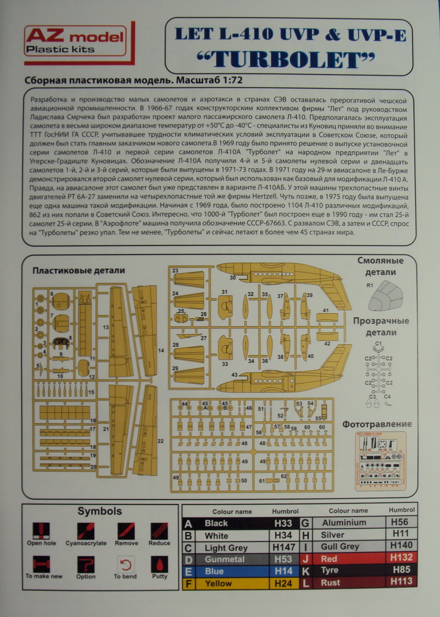 В коробке с глянцевой мягкой крышкой, и таким же основанием, на которое нанесена схема окраски и наклейки декалей, имеется: