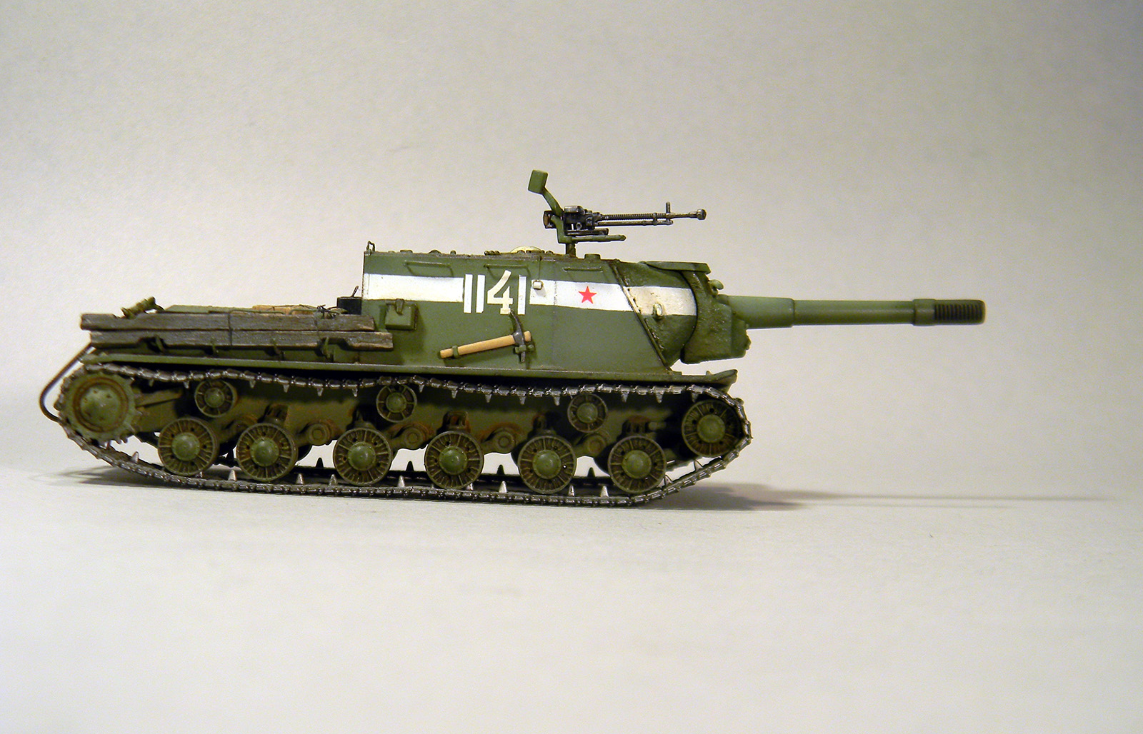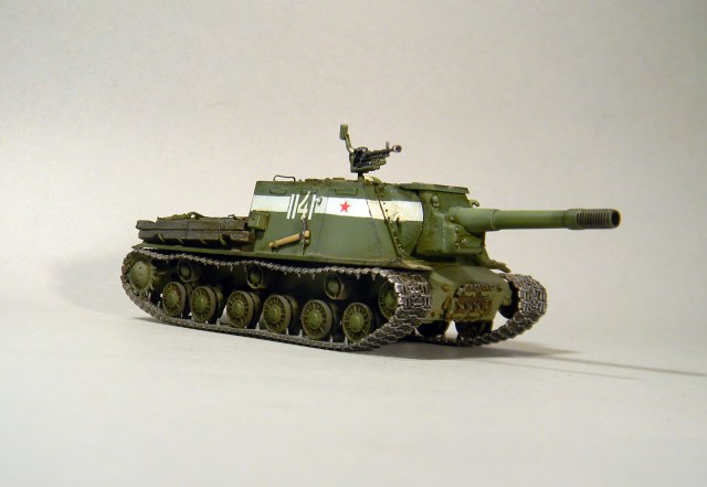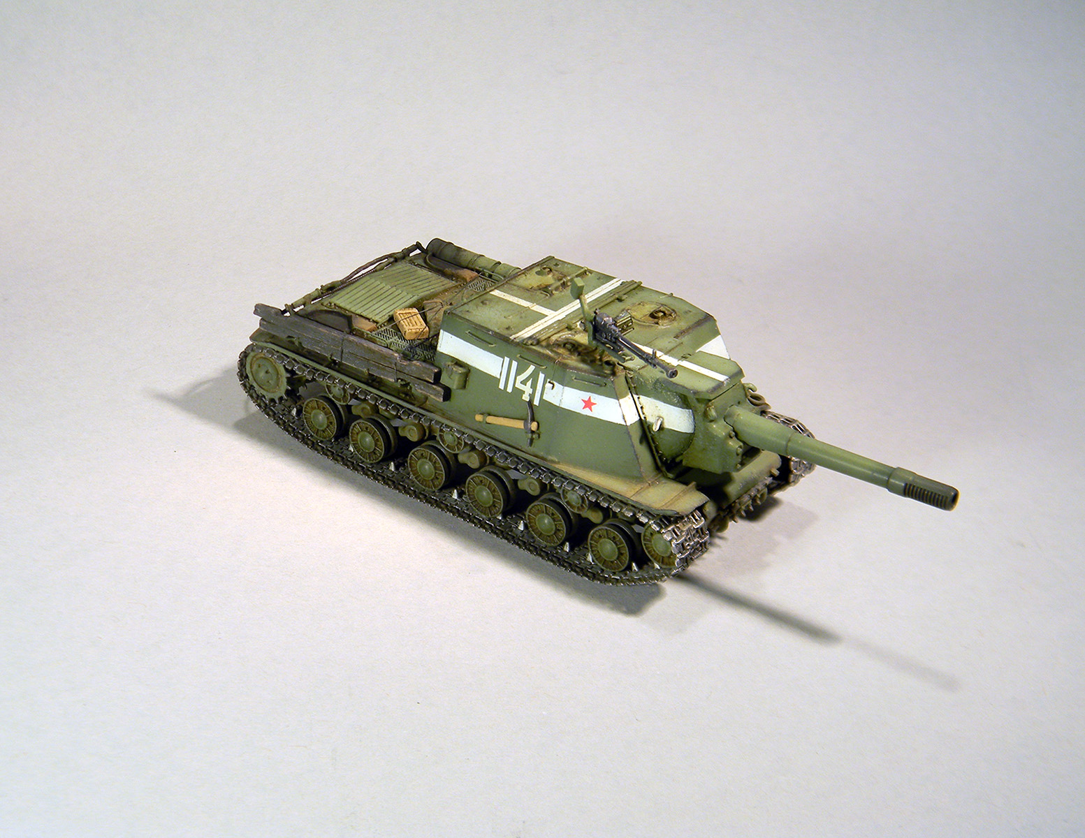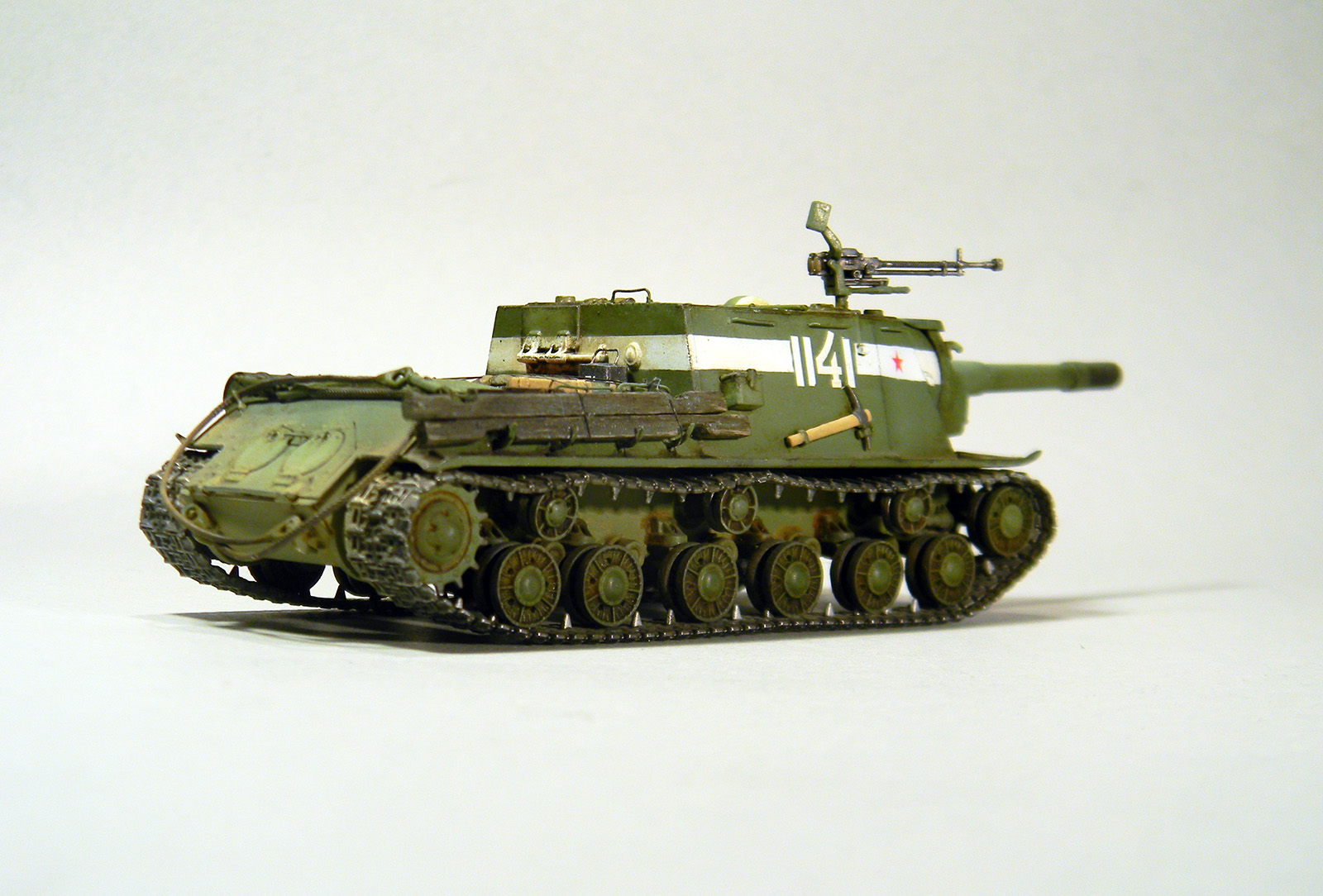 Красить модель я решил под некий сборный образ берлинской Исушки, вдохновившись фото ИСУ, Ис-2 и другой техники с полосами быстрого опознавания для авиации. Конкретной привязки к прототипу - нет, да и цели собрать супер-копийную модель не ставилось.