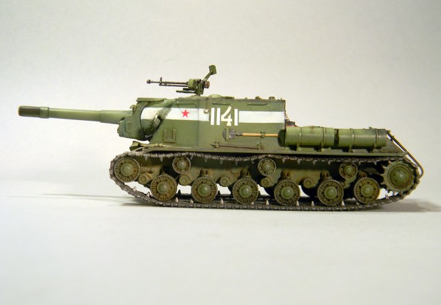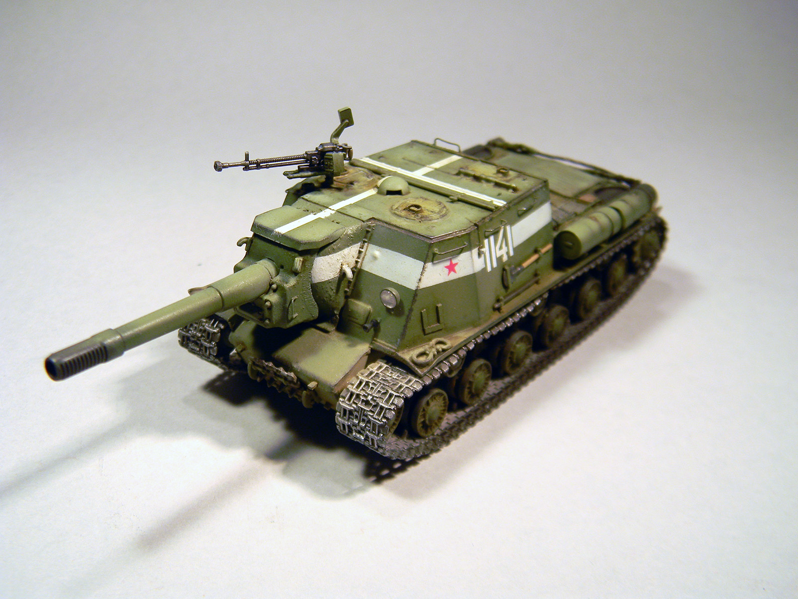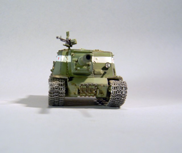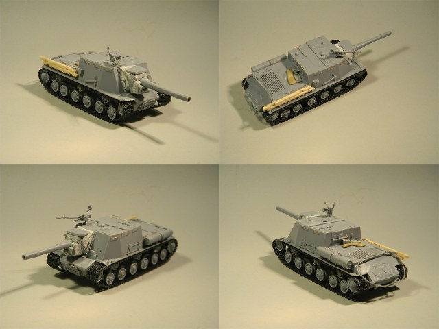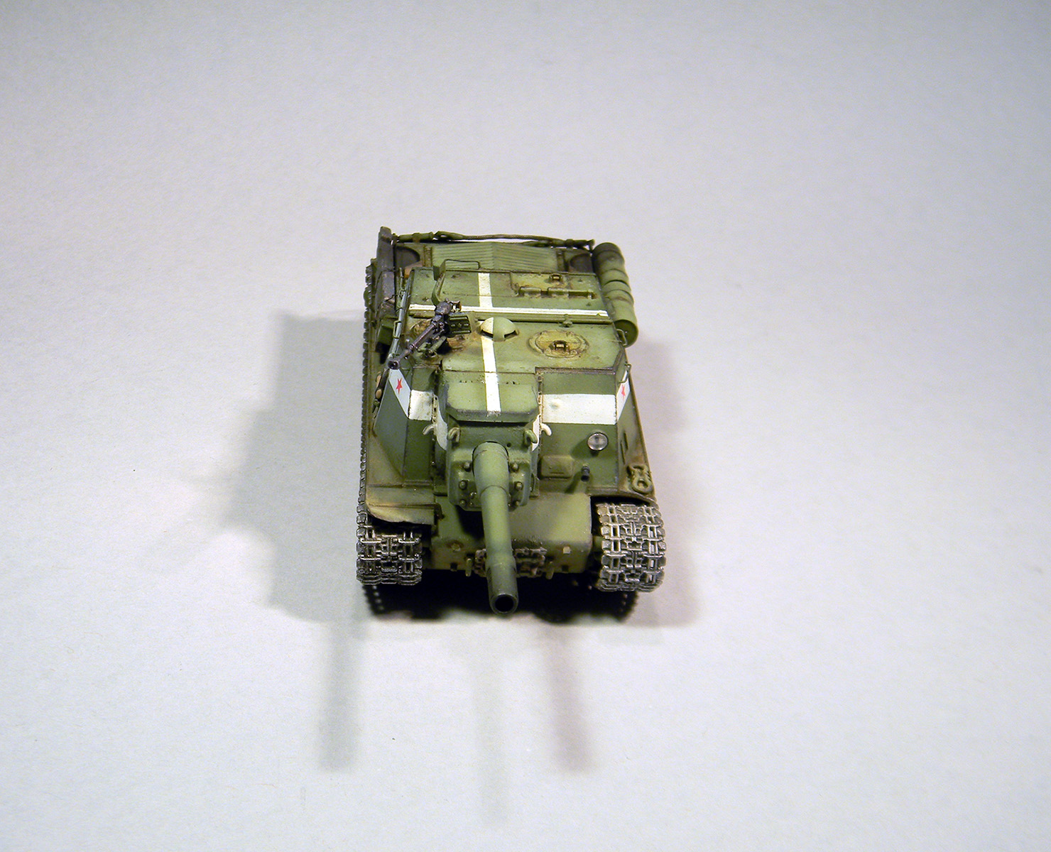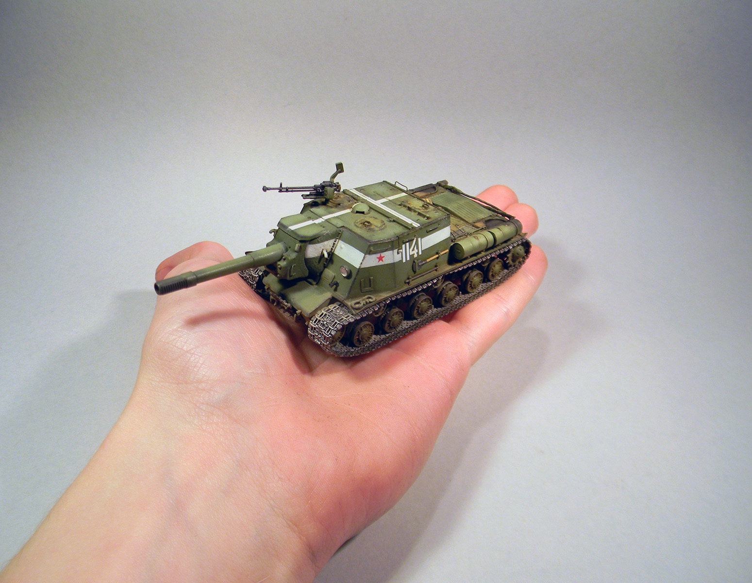 Красить модель я решил под некий сборный образ берлинской Исушки, вдохновившись фото ИСУ, Ис-2 и другой техники с полосами быстрого опознавания для авиации. Конкретной привязки к прототипу - нет, да и цели собрать супер-копийную модель не ставилось.