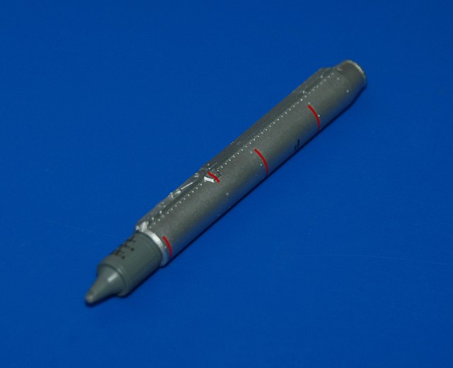 Снятие деталей с литников заняло всего несколько минут. ГЧ входит в ПУ очень плотно и надежно фиксируется даже без клея. При подвеске боеприпаса на пилон установка ушек и упоров необязательна, они даются для возможности демонстрации С-25-го на тележке рядом с моделью. А показать есть что, деталировка замечательная. Проработаны крепежные втулки, заклепки, электрические разъемы, прямоугольная крышка механизма фиксирующего ракету от продольных перемещений. Форма конического обтекателя боевой части С-25-ОФМ выполнена правильно, имитированы крепежные винты и сварочные швы обечайки. Чувствуется хорошее знание матчасти.