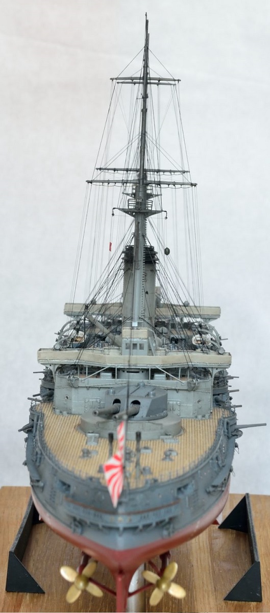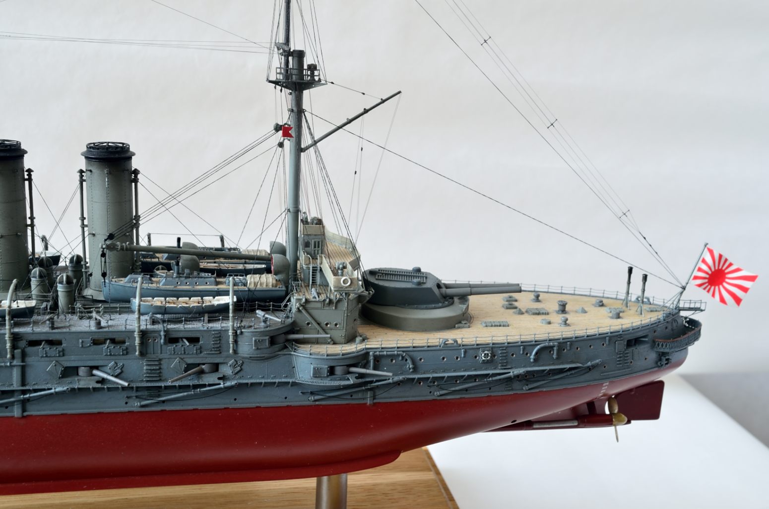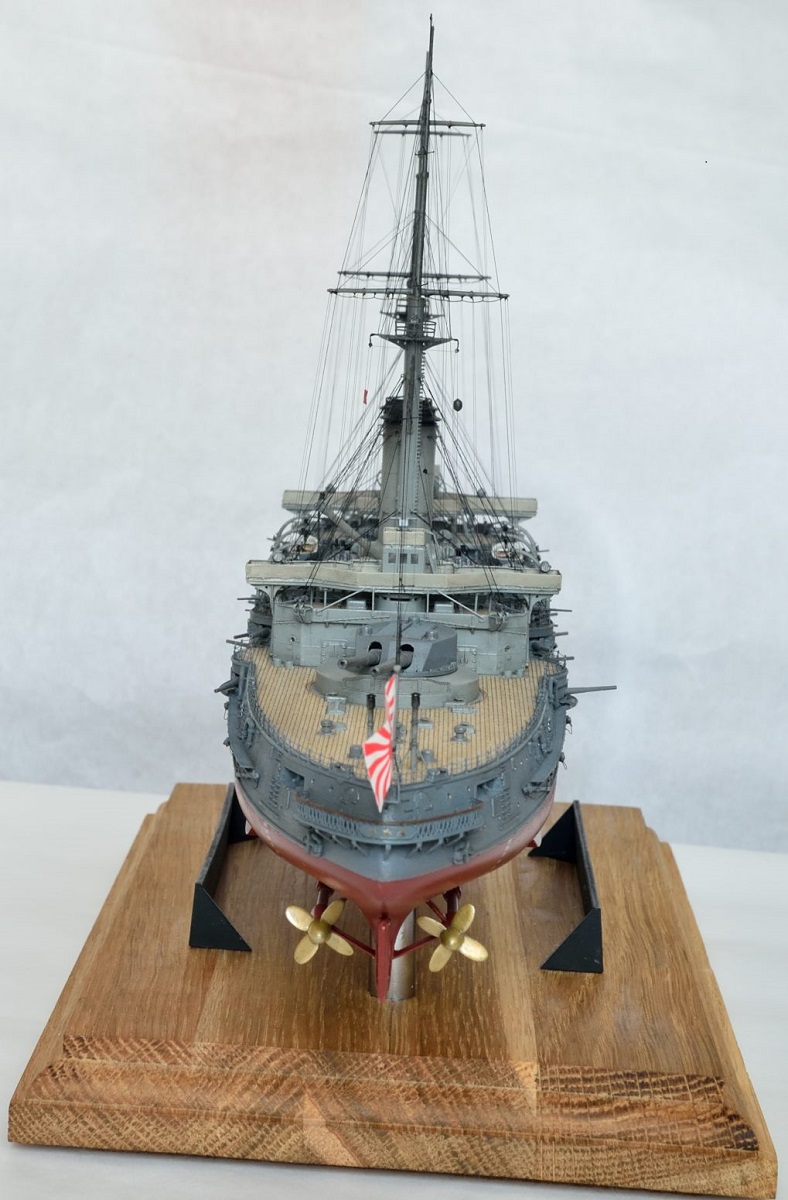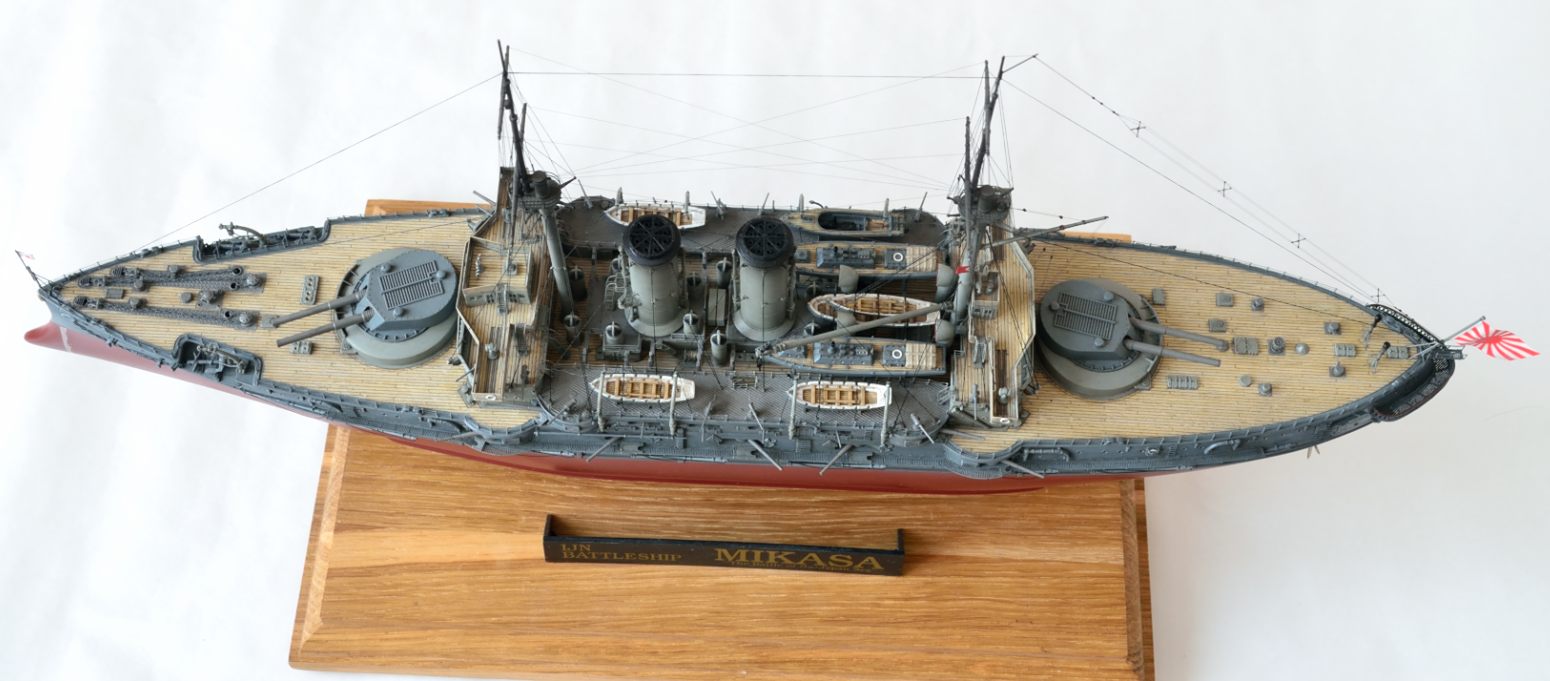 Эскадренный броненосец "Микаса" был построен в Англии на верфях фирмы "Викерс" в период с 1899 по 1902 г. Сразу был переведен в Японию, где и служил все свое время. В процессе службы корабль неоднократно переделывался и модернизировался в соответствии с требованиями, которые предъявляло ему время и командование. Корабль имел удивительную и уникальную судьбу и славен он не только тем, что был флагманом во всех значимых морских сражениях русско-японской войны, но и тем, что сумел уцелеть до наших дней. После триумфа в русско-японской войне "Микаса" побывал в различных переделках, в том числе осенью 1905 г. он умудрился взорваться и затонуть прямо на рейде, после чего два года его поднимали и ремонтировали. Далее в первую мировую он выполнял функцию береговой охраны, а позднее в составе японской эскадры принимал участие в интервенции во Владивостоке. В 1926 г. в Японии было принято решение увековечить память данного корабля и всех событий, что с ним были связаны. Был вырыт котлован, в него был заведен корабль и полностью засыпан по ватерлинию. Так "Микаса" стал музеем, на открытии которого 12 ноября 1926 г. присутствовал и сам адмирал Того Хейхатиро. Но и на этом приключения корабля не закончились. Вплоть до начала второй мировой войны "Микаса" сохранял свою аутентичность, был музеем, на нем была расположена экспозиция посвященная русско-японской войне 1904-1905 г. Во время второй мировой войны "Микаса" был сильно разрушен, потерял статус музея и был полностью разграблен. Вплоть до 1959 г. он сохранялся в виде корпуса зарытого в землю и "работал" как придется - это был и склад и танцплощадка и даже аквариум. А вот далее началось активное движение по возрождению музея, чему надо отметить способствовали и американские оккупационные власти в лице знаменитого адмирала Ч.Нимитца. И только в мае 1961 г. корабль был восстановлен и представлен вновь как музей. Надо сказать, что восстанавливали его что называется с миру по нитке, были очень скудные источники финансирования и очень жесткие условия оккупации, которые не позволяли тогда иметь Японии вообще вооруженные силы. Видимо из-за совокупности этих, а возможно и ряда других причин, восстановление корабля производилось крайне небрежно и с большими (если не сказать огромными) отступлениями от оригинала. В результате, сегодня "Микаса" находящийся в специальном парке на берегу японского моря в г. Йокосука лишь отдаленно напоминает тот грозный и бесспорно красивый и гордый корабль, модель которого я имею честь вам всем представить.