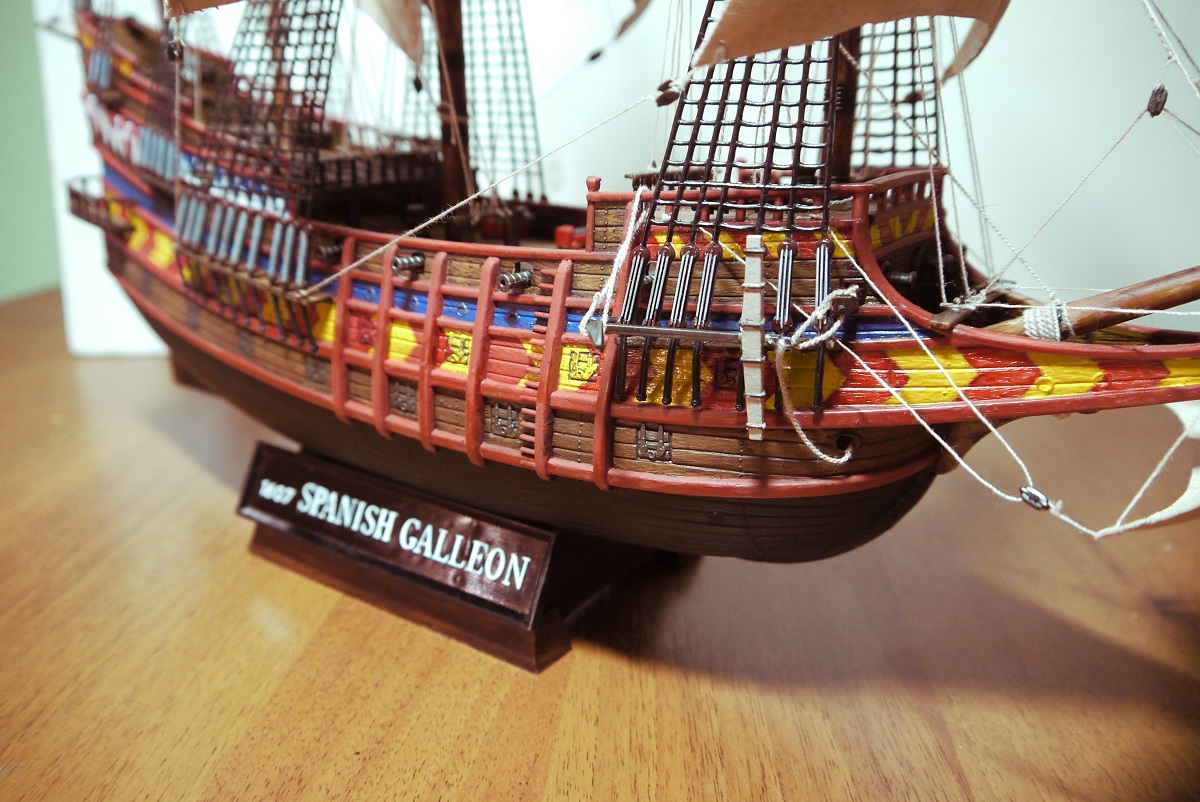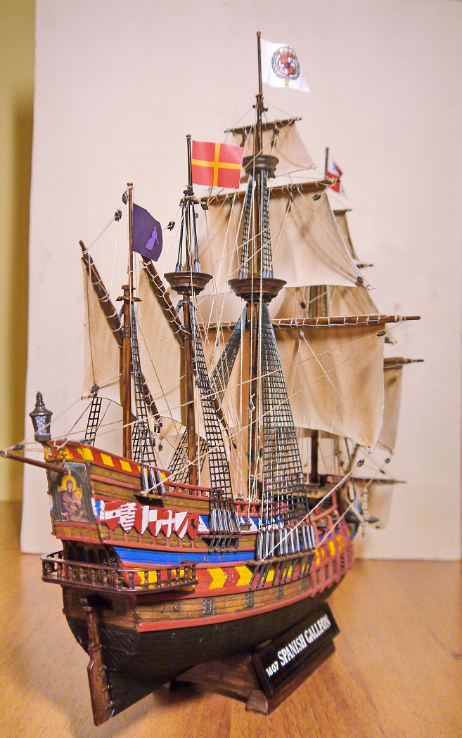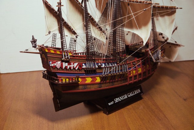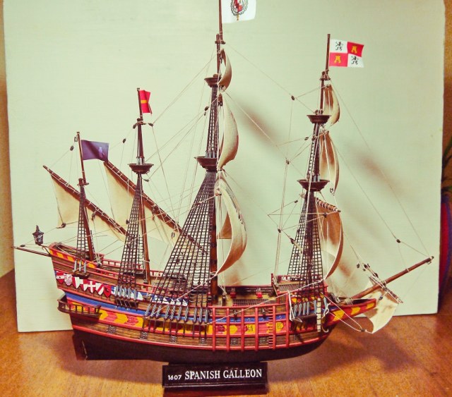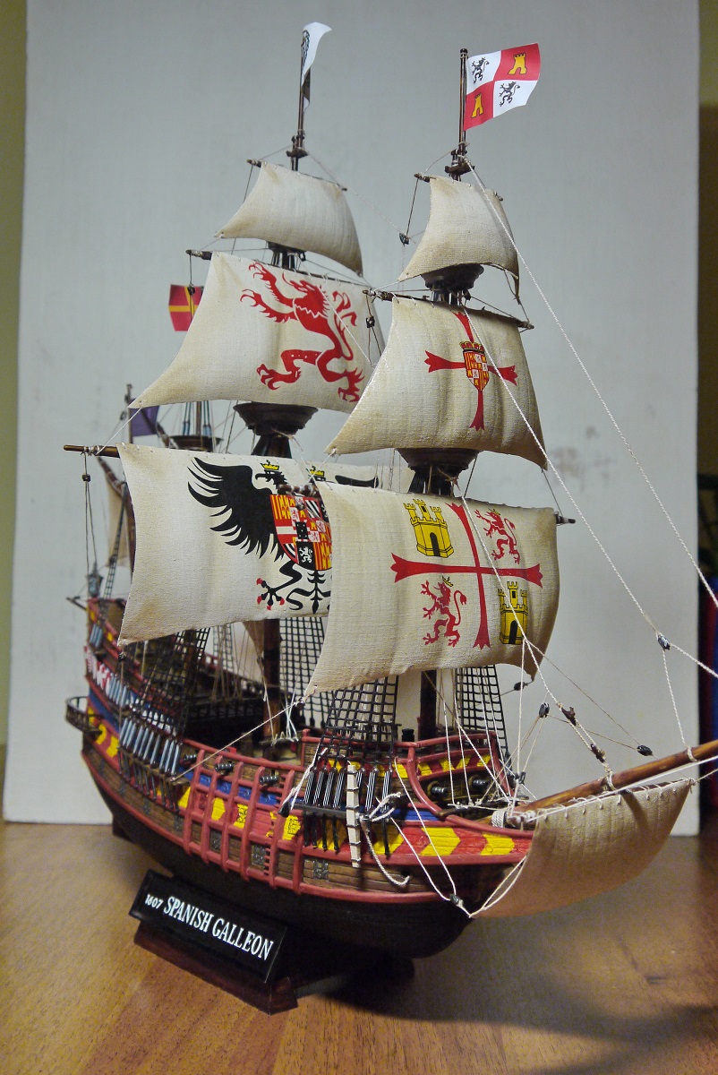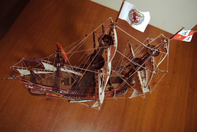 Испанский галеон, масштаб 1:100, размеры: длина-495 мм, ширина-223 мм,высота-439мм.Из пластмассы.Делал первый раз- из коробки- всё по инструкции.Ванты плести не умею поэтому из пластмассы.На рисунке был ещё такелаж но в инструкции не было.Наверное слега упрощенный вариант.Я пока в оснастке и такелаже дилетант.На коробке написано- для детского технического творчества.Я хоть далеко и не ребёнок а подзаколебался собирать)))Спасибо всем за комментарии.Выложил другие фотки-немного т.к рассматривать особо нечего. Ванты перекрасил.А паруса так приклеил к реям потому что эффект надутых парусов хотел передать.По другому не знаю как.