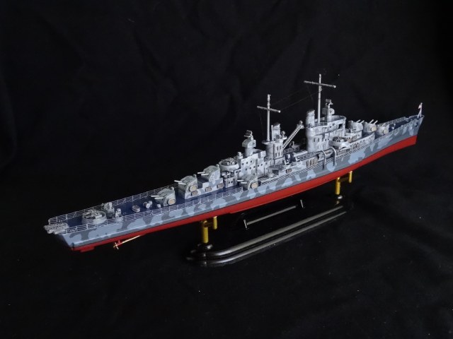 Выбрал камуфляжную схему 12 cпятнами, т.к. не хотелось однотонности. Красил кистью, красками Mr.Hobby(палуба - BlueFS 15050, надстройка – GrayFS 36270) и АКАН (пятна –Океанический серый, борта – Шаровая 29, подводная часть – смесь чисто красного и коричневого 1:1). Использовал также смывку MIG. Подставку уже красил аэрографом, а табличку золотом от АКАНа, предварительно сделав на ней искусственную рифленость с помощью вымококонцентрированного растворителя.
