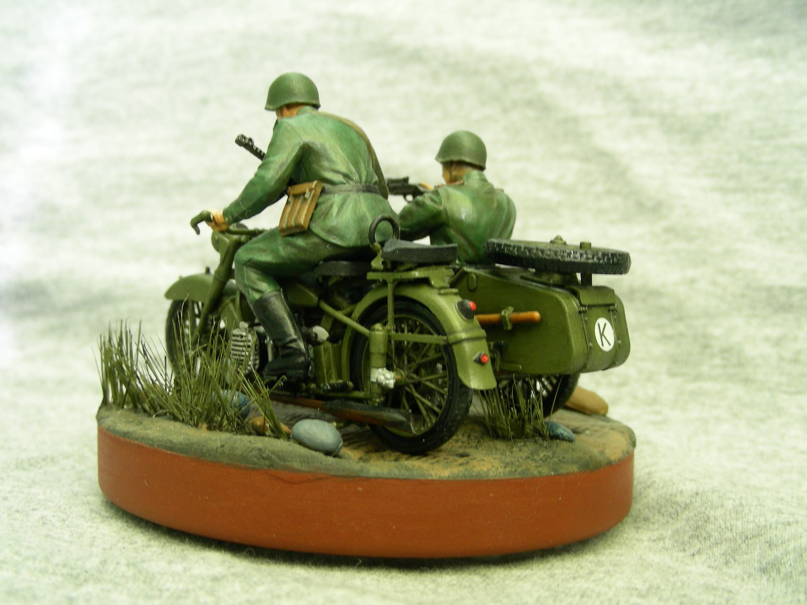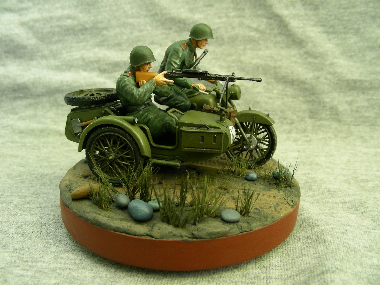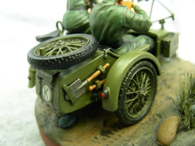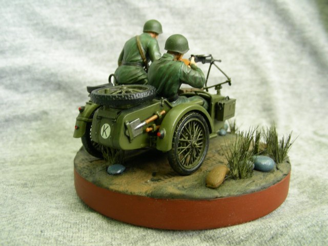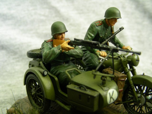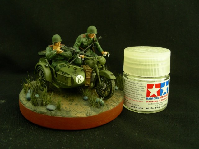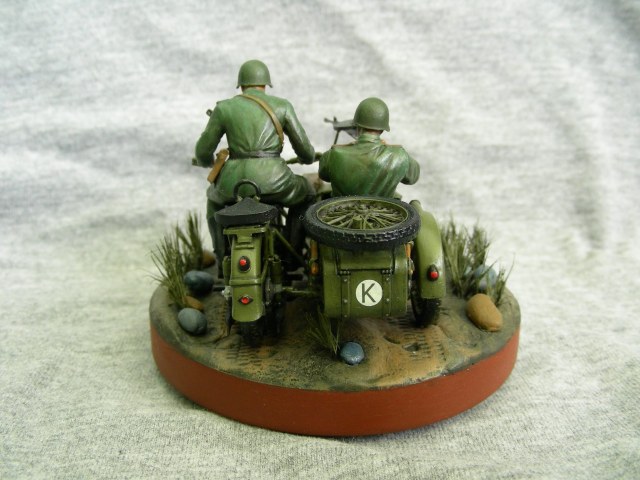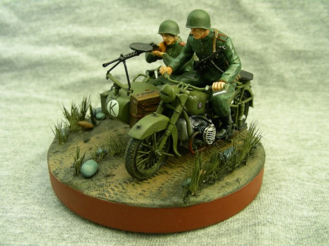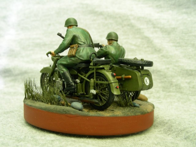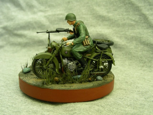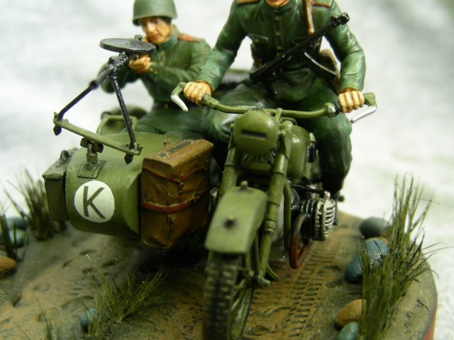 Покраска производилась кистью, краской АКАН. Фигуры расписывал впервые, для формы солдат использовал «Хаки» от Звезды по инструкции, но мне сказали что это не тот «Хаки». Модель мотоцикла намного легче и лучше было бы расписать аэрографом, но не было. Смывка от MIG.