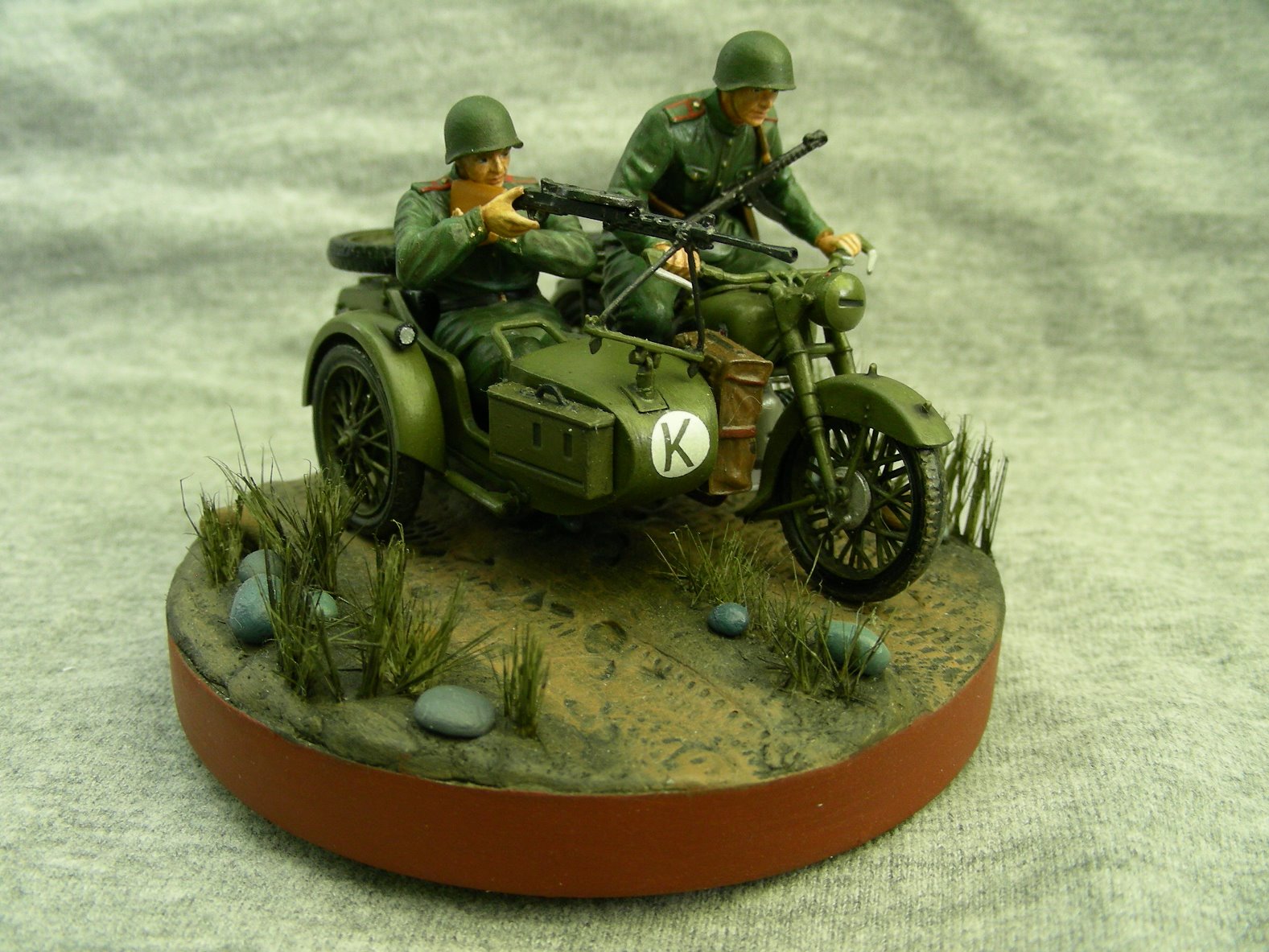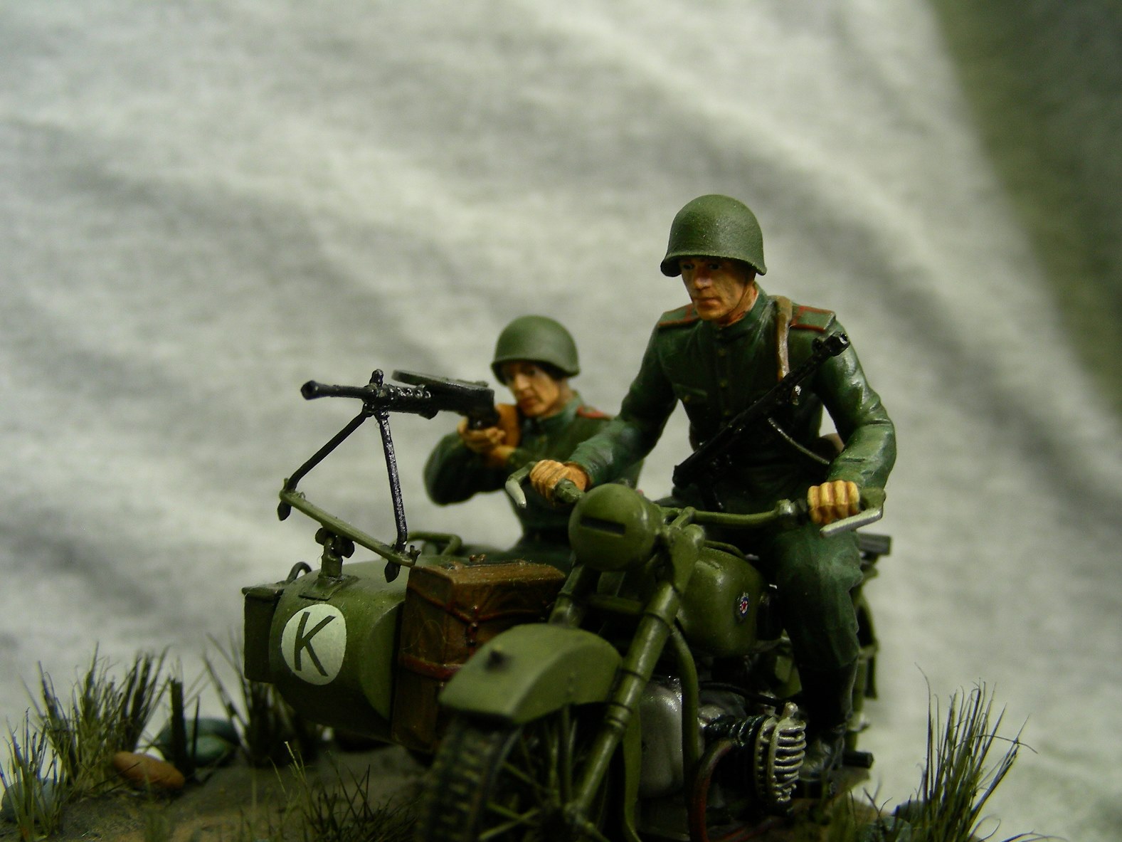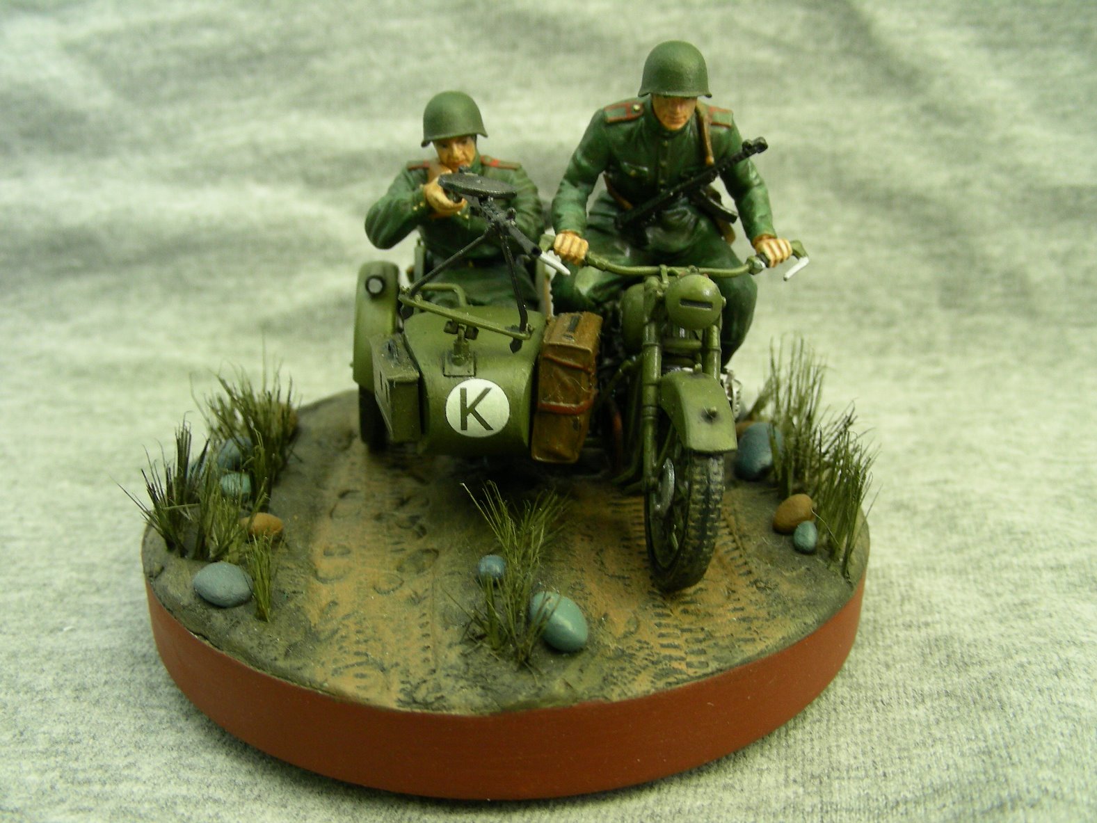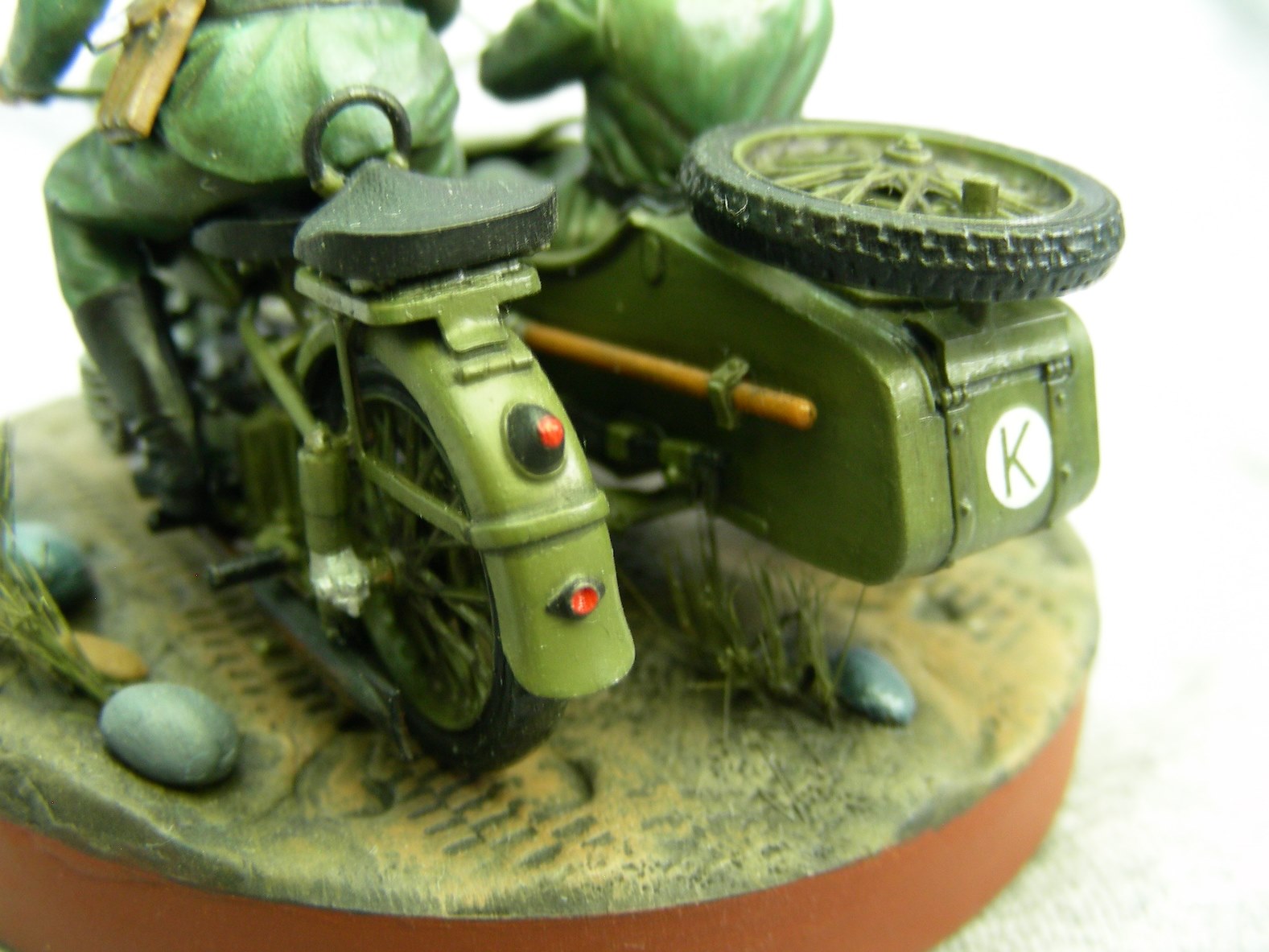 Покраска производилась кистью, краской АКАН. Фигуры расписывал впервые, для формы солдат использовал «Хаки» от Звезды по инструкции, но мне сказали что это не тот «Хаки». Модель мотоцикла намного легче и лучше было бы расписать аэрографом, но не было. Смывка от MIG.