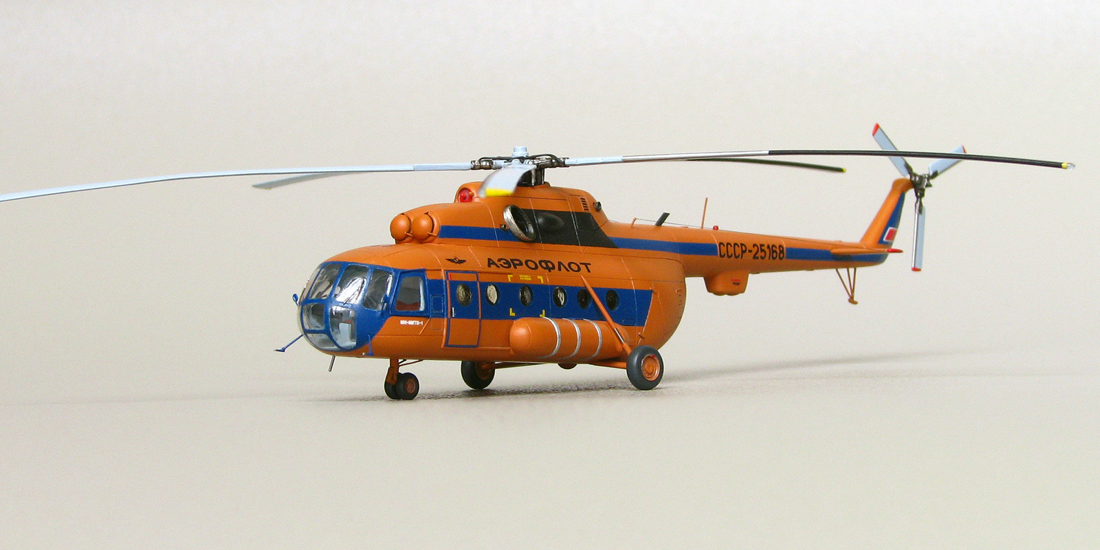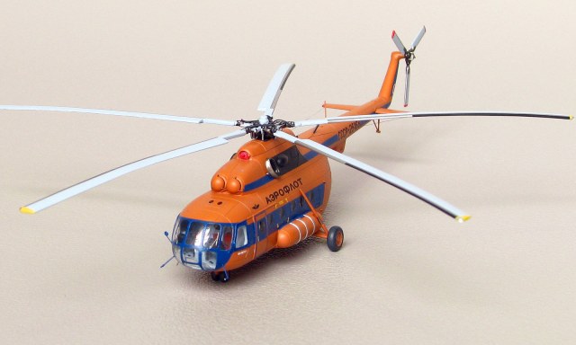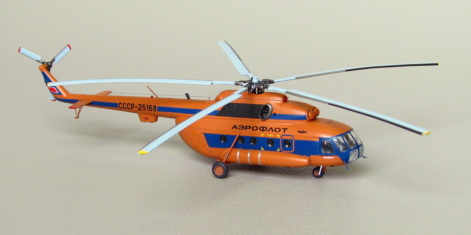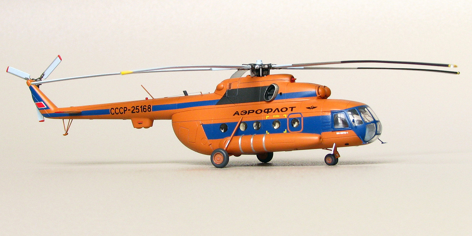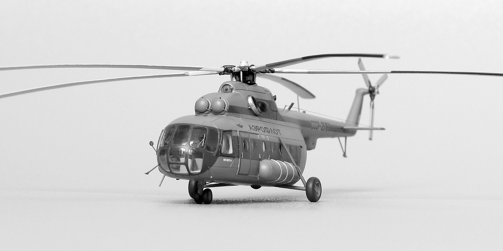 Модели от Восточного экспресса нельзя назвать лёгкими, но они дают возможность почувствовать себя настоящим моделистом за что можно сказать спасибо их создателям. Не стал исключением и Ми-8. Изучение матчасти привело к тому, что мы имеем вариант МТ а никак не МТВ-1 как заявлено на декали. Но эта информация была найдена уже после того как декаль была наклеена а модель покрыта лаком. Из-за того что вовремя не смог найти в сети фото прототипа с регистрацией СССР-25168, модель получилась собирательным образом вертолета. На профильном ресурсе возник спор о правильности цвета, но каждый остался при своих. Приведу ч/б фото реальной машины и снятое в ч/б фото своей модели. Отличий практически нет. Все мелкие детали за редким исключением были сделаны самостоятельно. От модели Ми-24 были заимствованы втулка подъемного винта и весь рулевой винт, они как известно одинаковые на этих машинах. Немного деталирована кабина, но толстое стекло не позволяет это увидеть. При покраске были использованы маски от AVB. Окрашивал нитрокрасками. Из декали взял лишь регистрацию, надписи Аэрофлот, птичку и флаг.