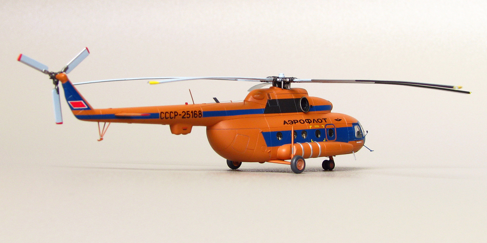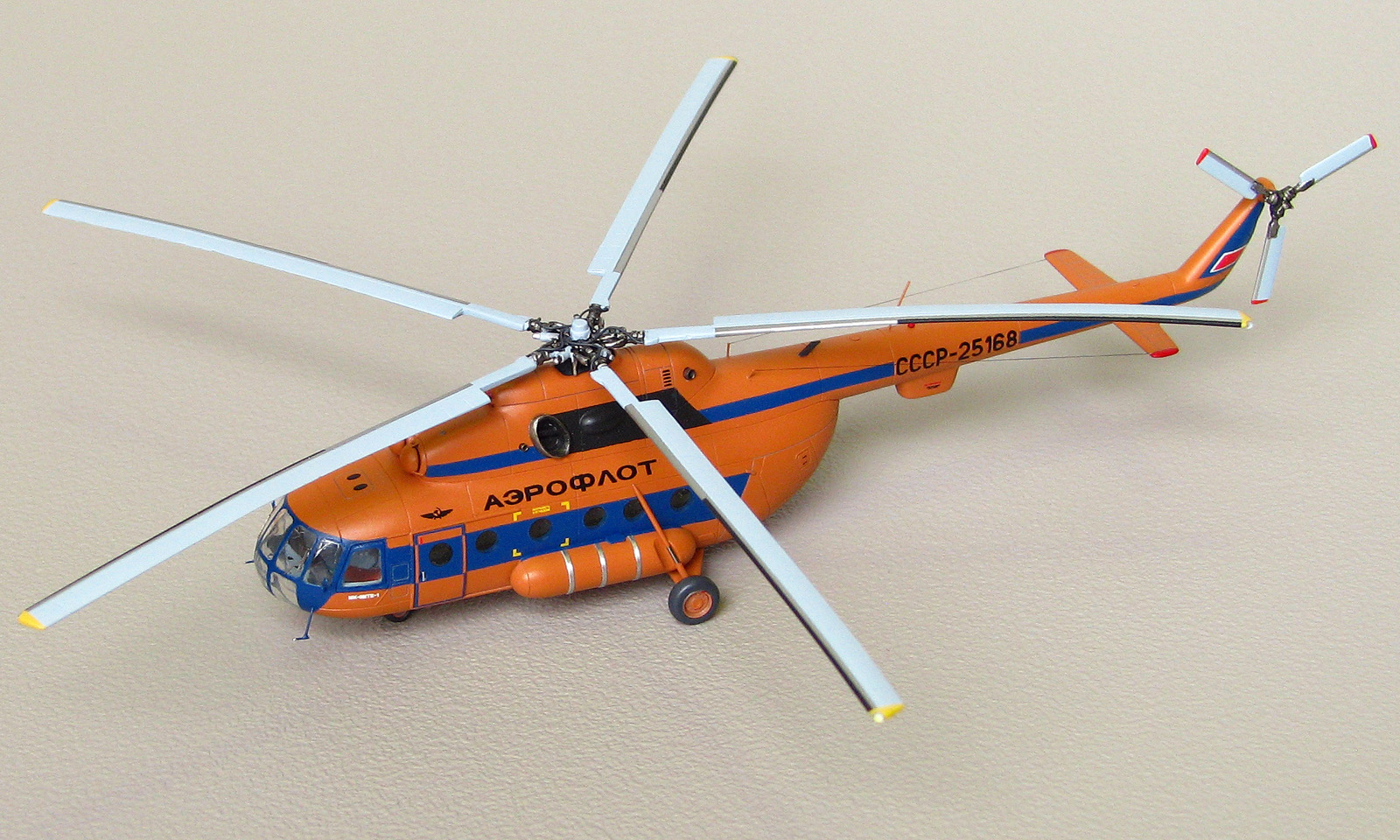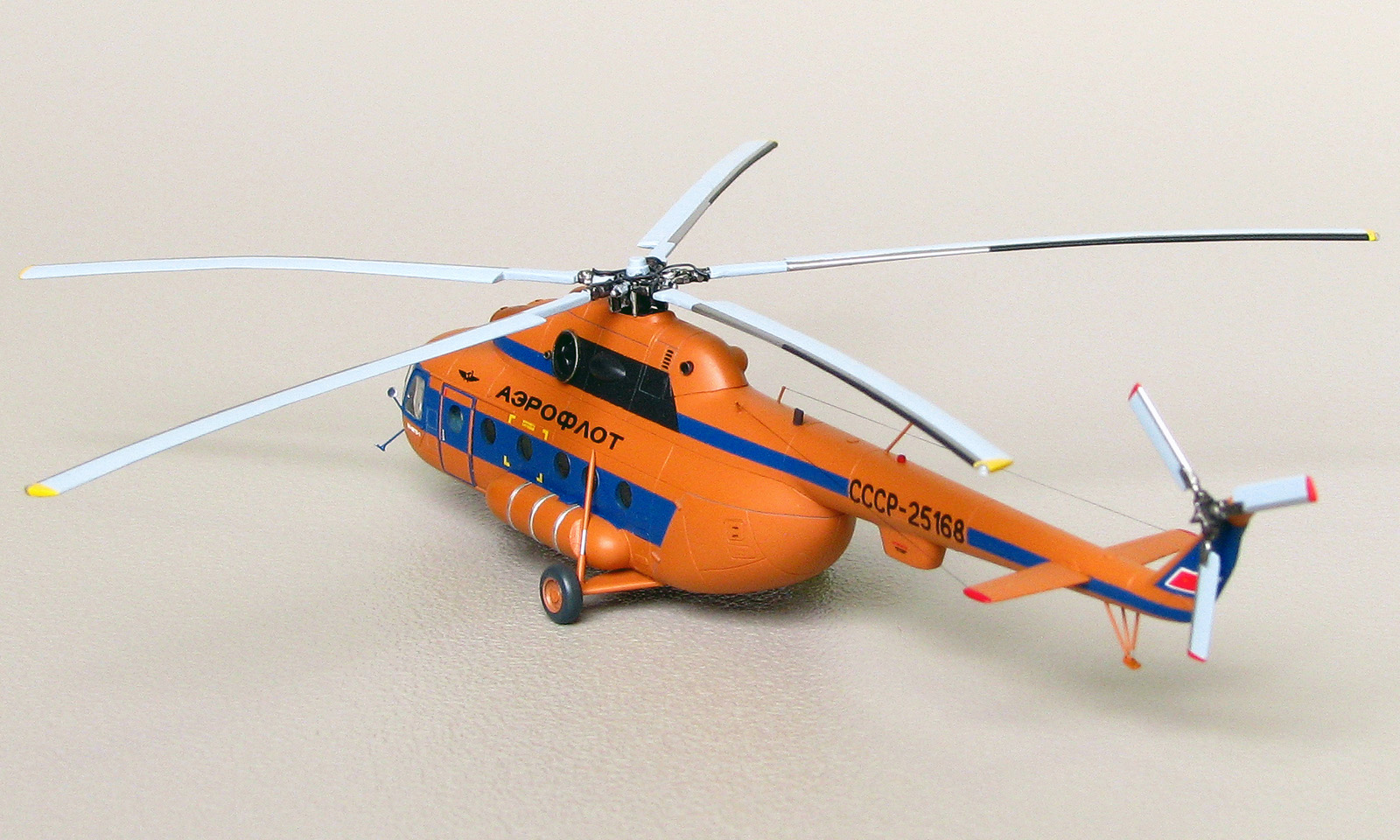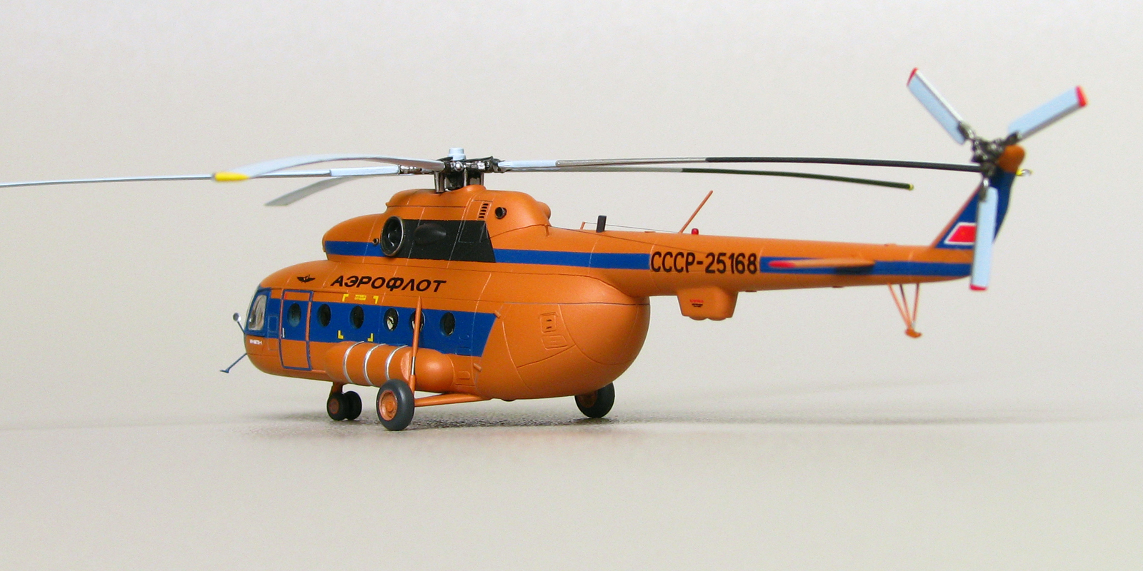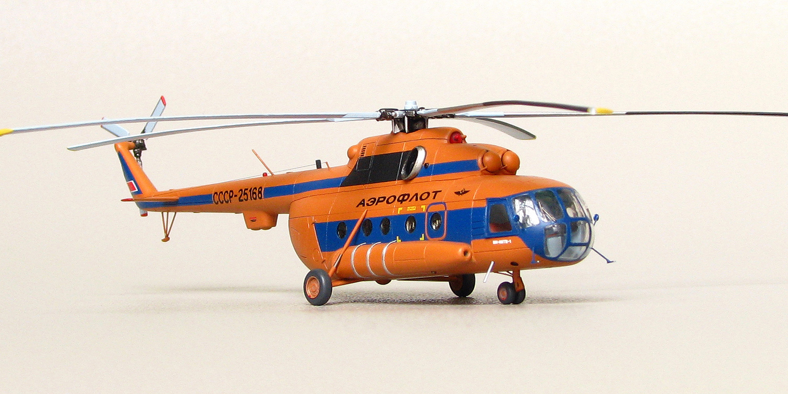 Модели от Восточного экспресса нельзя назвать лёгкими, но они дают возможность почувствовать себя настоящим моделистом за что можно сказать спасибо их создателям. Не стал исключением и Ми-8. Изучение матчасти привело к тому, что мы имеем вариант МТ а никак не МТВ-1 как заявлено на декали. Но эта информация была найдена уже после того как декаль была наклеена а модель покрыта лаком. Из-за того что вовремя не смог найти в сети фото прототипа с регистрацией СССР-25168, модель получилась собирательным образом вертолета. На профильном ресурсе возник спор о правильности цвета, но каждый остался при своих. Приведу ч/б фото реальной машины и снятое в ч/б фото своей модели. Отличий практически нет. Все мелкие детали за редким исключением были сделаны самостоятельно. От модели Ми-24 были заимствованы втулка подъемного винта и весь рулевой винт, они как известно одинаковые на этих машинах. Немного деталирована кабина, но толстое стекло не позволяет это увидеть. При покраске были использованы маски от AVB. Окрашивал нитрокрасками. Из декали взял лишь регистрацию, надписи Аэрофлот, птичку и флаг.