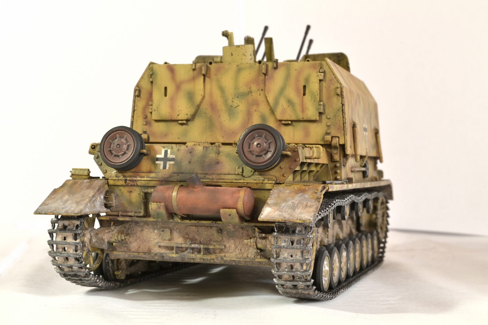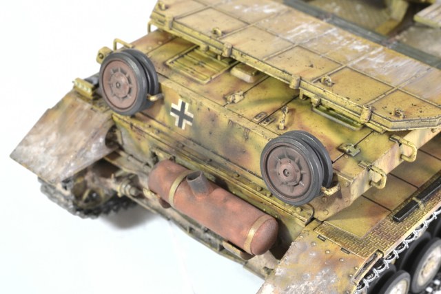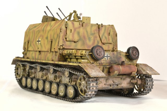 Модель довольно древняя, еще из тех, что с отсеком под моторчик и батарейки в корпусе, но сборка в общем приятная. Добавил кое где сварные швы и недостающие болты/гайки. Траки от Драгона – Меджики, и с ними поменял ведущие звездочки, так как на родные Мэджики не налазят. Красил красками Тамия, фильтр Миг, смывки Миг и Тамия, масло, пигменты W.