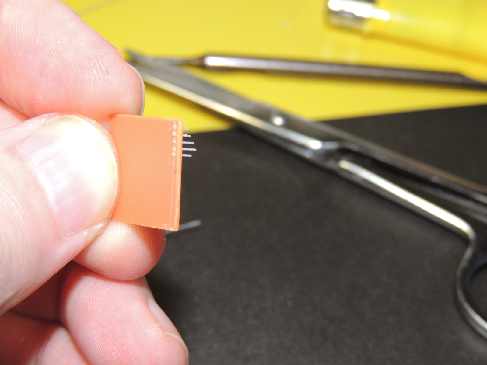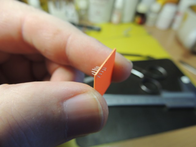 Итак, размечаем предполагаемый шаг клёпки(на моём примере шаг 1 мм). После разметки, проделываем отверстия(на выбор, сверло, тонкое шило, игла), причём делать это необходимо именно крутящими движениями(можно и минидрелью, кто как привык), иначе можно получить эффект застегивающегося пластика. Далее продеваем тянутый литник(ТЛ) в отверстия и срезаем его оставляя примерно по 1-1.5 мм. Хочется отметить маленький нюанс, величина клёпки зависит от толщины самого литника, а так же его длинны(к сожалению этот момент приходит с опытом и я рекомендую немного потренироваться) . Затем выравниваем если вы собираетесь воспроизводить клёпку партиями по 5-6 штук, вы повторяете этот процесс, затем выравниваете концы ТЛ. Далее берётся зажигалка, с выставленным заранее минимальным пламенем и просто подносите на доли секунды её к кончикам ТЛ. На месте обрезанных кончиков ТЛ появляются полукруглые заклёпки.