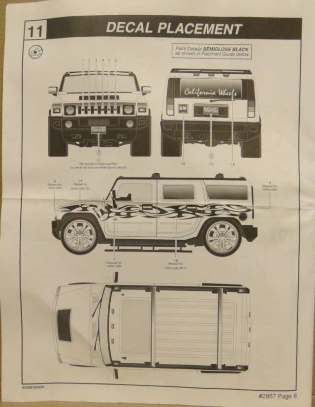 Приветствую Вас дорогие Каропчане и ещё небольшой обзорчик на фирму Revell автомобиль HUMMER H2. В коробке мы имеем инструкцию, кузов автомобиля, днище, ванночка салона, 9 литников серого, белого и чёрного цвета, 3 литника хром, 3 литника остекленения, 2 оси крепления колёс, резина, 6 болтиков для крепления частей кузова, декаль и буфер! При осмотре бросилась сразу в глаза необычная инструкция: там нет таблицы красок, как это есть в других инструкциях от Revell, цвета окраски здесь расписаны возле самих деталек. По самой машинке я был прямо приятно удивлён: облоя оооочень мало, в сравнении с другими китами которые попадались мне в руки. Качество отливок и стыкуемость просто обалденное! Детализация салона так же очень даже хороша. Revell предлагает нам сборку с открывающейся задней дверцей. Вот еслиб ещё капот открывался, то было бы вообще супер. В целом набор мне понравился, но это опять же первое впечатление, посмотрим какие подводные камни будут ждать при сборке.