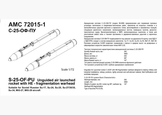 Прошло несколько дней с момента выхода моего обзора по С-25-ОФ в масштабе 1/48 (http://karopka.ru/community/user/9176/?MODEL=398515), а я вновь спешу предложить вашему вниманию набор авиационного вооружения компании АМ – АМС 72015-1 НАР С-25-ОФ-ПУ.
