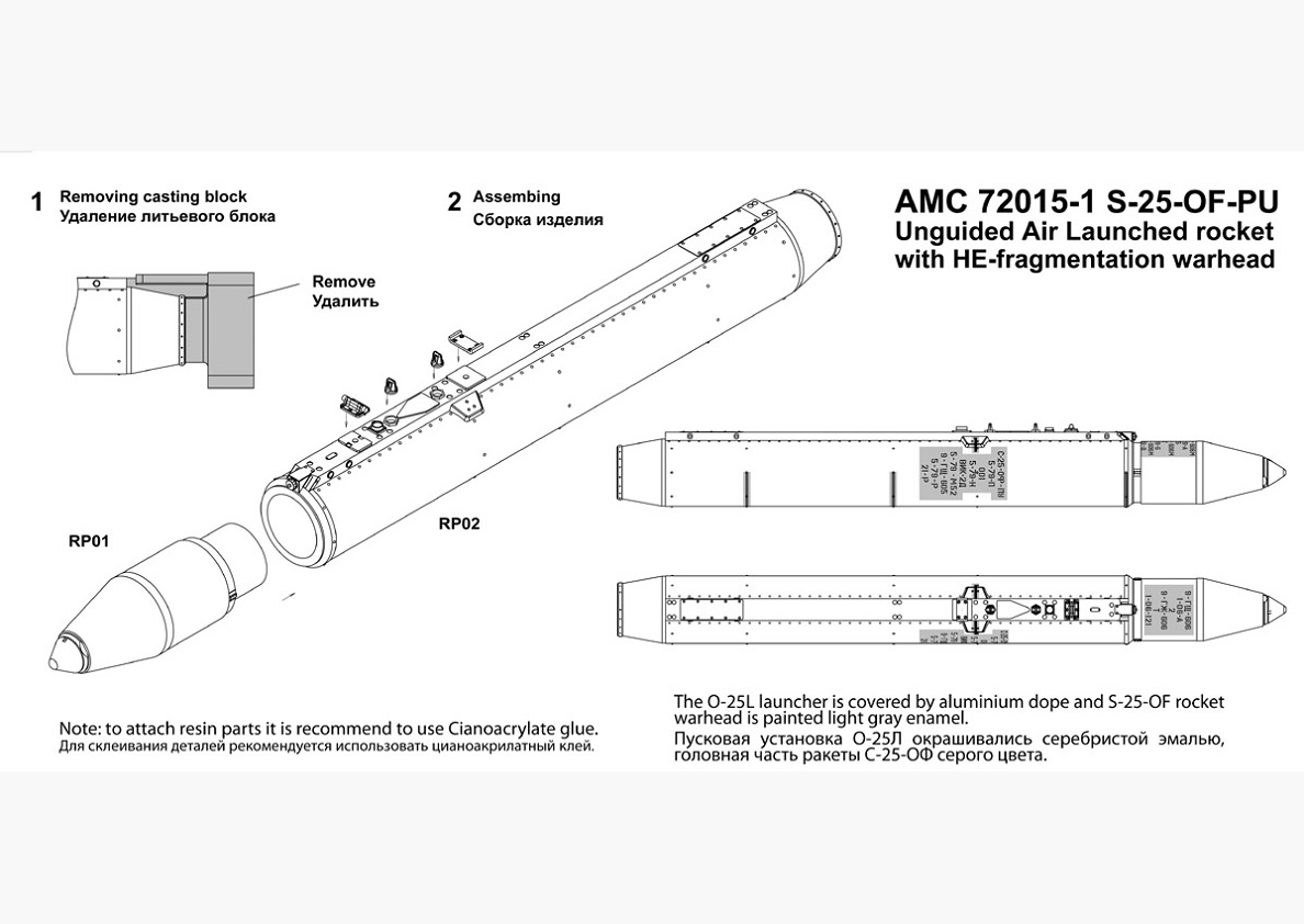 Детали отлиты из светло-серой полиуретановой смолы. Членение простое, пусковая установка О-25Л, головная часть (ГЧ) ракеты С-25ОФ.