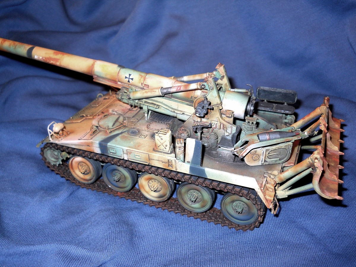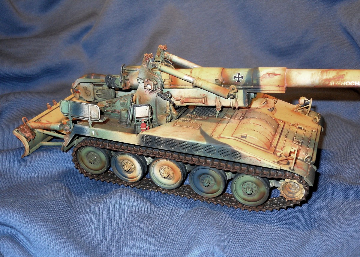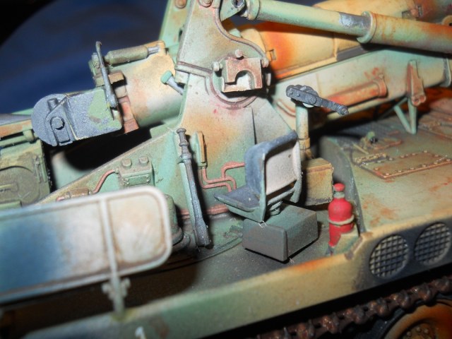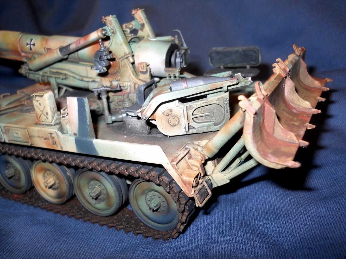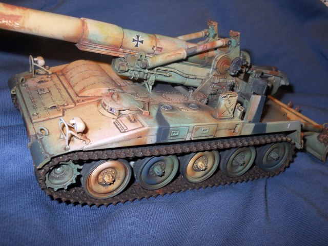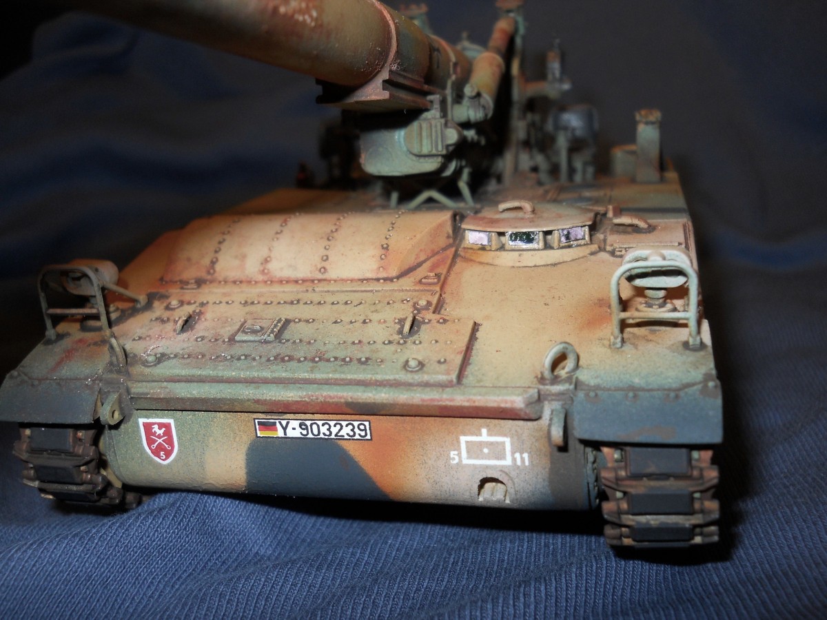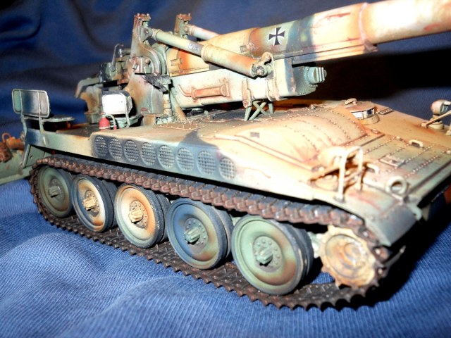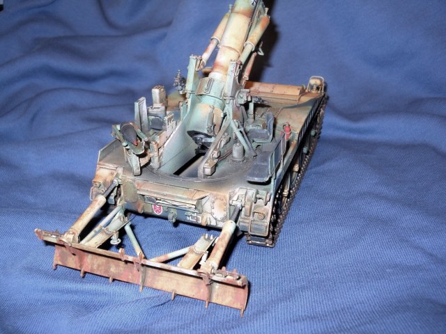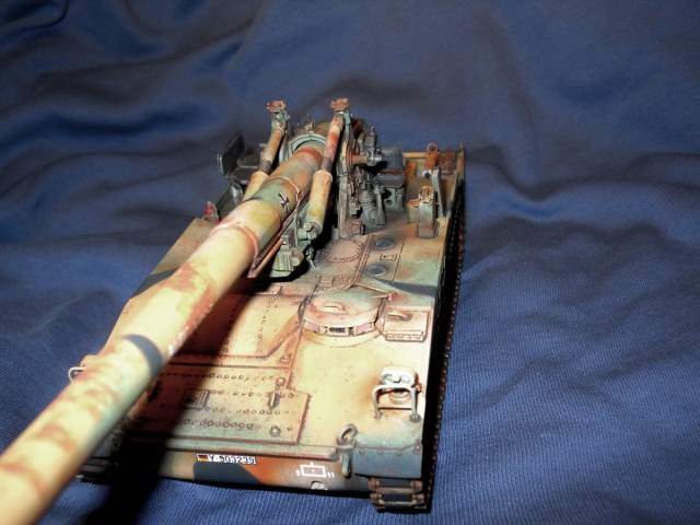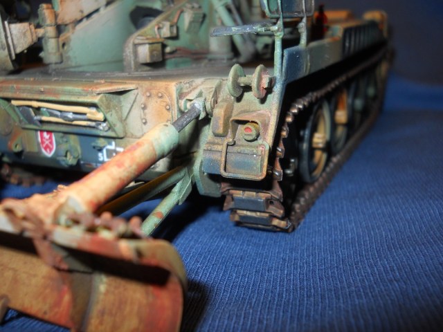 Теперь по модели. К сожалению средне. Из плюсов - внимательность к деталям покраски, у артиллерии множество разных материалов, элементов и все по разному красятся. Видно что вы внимательно к этому подошли. Понравились траки, резиновые вставки отдельно покрасили, все как надо. Минусов много. Множество не счищенных швов и облоя. Вы аэром красили или кистью? Больше похоже на кисть, потому что ощущение очень толстых слоев краски, подтеков, это видно на мелких деталях на углах. У них геометрия "заплыла", не знаю как еще сказать. Детали цвета голого металла следует обработать сухой кистью в цвете светлой стали или алюминия, сами увидите как они заиграют и станут натуральными. С триплексами какая-то беда совсем. На декали сверху надо фильтр, пигменты, что бы они так сильно с корпусом не контрастировали, он то пыльный, а они чистые.