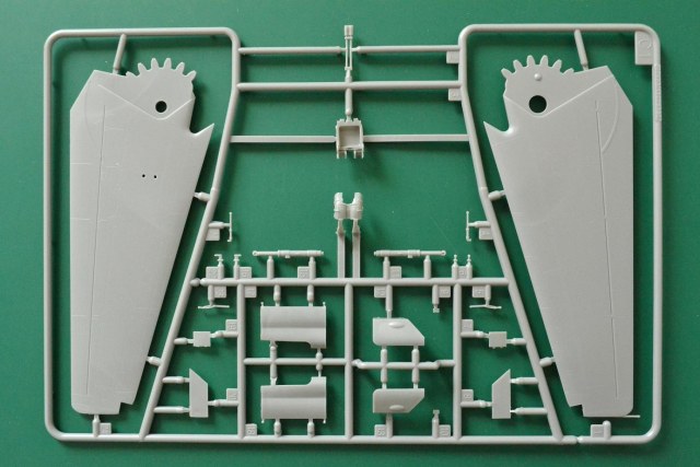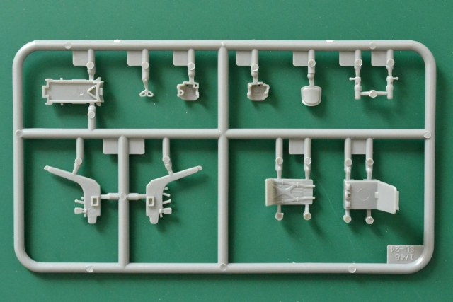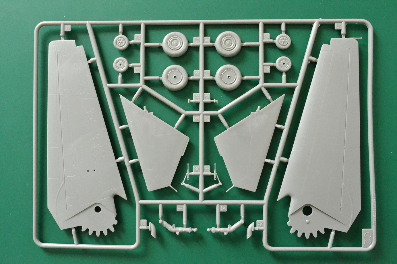 В прямоугольной коробке из плотного картона лежат: 15 серых полистирольных рамок (больших и малых), 2 рамки с деталями из прозрачного пластика, одна латунная пластина с ФТД, два листа декалей и инструкция по сборке с вариантами окраски самолета.