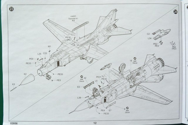 Все детали на рамках отлиты ровно, гладко, чисто и без облоя. Следы толкателей имеются, но с обратной стороны (впрочем, как и везде). Расшив аккуратный ровный и не глубокий, так же присутствует ровная и красивая клепка. "Стеклянные" детали тоже исполнены на высоком уровне. Не вооруженным глазом видна достаточная их прозрачность. Декали сделаны с четкой печатью, без смещения по границам. И включают в себя подробную техничку для вооружения и ПТБ. На втором листе, изображены ОЗ с подробными технаписями двух самолетов с б/номерами 07 и 58 из разных ИАП участвовавхших в войне в Афганистане. При большом увеличении видны ошибки в словах. Подробная инструкция с хорошей печатью и подробными схемами сборки, позволяет без труда собрать модель. Помимо неё, есть две схемы окраски камуфляжа с расположением декалей на подвесном оружии (ракетах класса В-В), на ПТБ и пилонах.