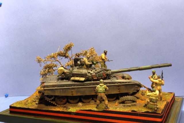 А вот наполнение работы, уж простите, никуда не годится, я поясню почему. Во-первых, в танке совершенно не угадывается танк ВСУ, не познавательных знаков, не полос вторжения, совершенно ничего. Тоже самое, касается фигурок. Эту же работу, можно было бы легко озаглавить как "В Чечне", и название вполне бы соответствовало изображенному на диораме. Далее, позы, что сепаратистов, что солдат украинской армии, смотрятся совершенно нелепо для данной ситуации. Тут нужна либо более глубока конверсия фигурок, либо нужно было лепить их "с нуля".
