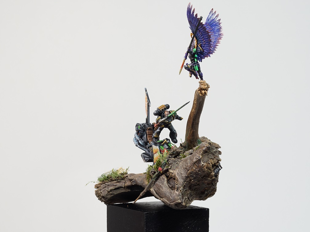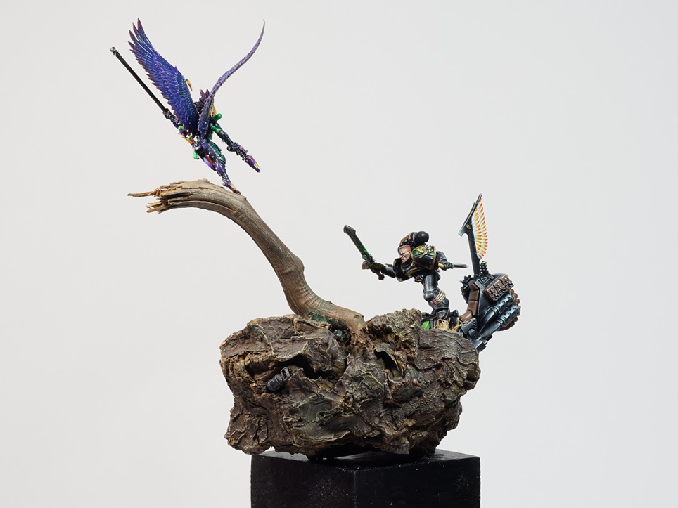 достигал длительным "драйбашем", база изготовлена в первую очередь и за полгода как-то запылилась и потускнела. Космодесантника постарался сделать членом Крыла ворона, всяческие блики и отсветы на нём, по моему, не очень удались, но как сделать лучше я пока не нащупал, мотоцикл считаю более удачным, но по правде говоря, в живую он выглядит менее "зрелищным"- особенно удивило как на фото выхлопные трубы вылядят, хотя вживую имитация хромирования смотрится хуже- вопрос -почему???, ещё контрастнее нужно? Тёмный эльдар- цветовая гамма отсебятинная- хотелось фиолетового, хотелось поиграть ц цветами- очень интересно как со стороны - гармонично смотрится или нет??? Вот как-то так, спасибо за внимание, ожидаю продуктивной критики.
