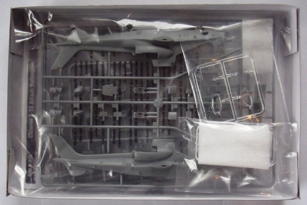 О модели: в коробке из тонкого картона с верхней загрузкой, находятся 7 литников, 5 литников из пластика серого цвета, 2 литника с элементами кабины из прозрачного пластика. Каждый литник аккуратно упакован в отдельный запаянный целлофановый пакет, причем литник с кабиной, два одинаковых литника с вооружением, несколько отдельных особо хрупких детали, дополнительно защищены (не знаю как правильно называется) неким подобием поролона. Так же в коробке имеется одна картонка с декалями и инструкция по сборке на восьми страницах, на отдельном листке цветная схема окраски вертолёта (один вариант окраски). Инструкция по сборке и окраске на двух языках, китайском и английском. Литники из тонкого и прочного пластика, хорошо отлиты, все детали хорошо детализированы, расшивка вся присутствует. Смещения пресс форм обнаружено не было, облой практически отсутствует. Цена на момент покупки составляла 840 руб. Вот вроде бы и всё :) Приятного просмотра.