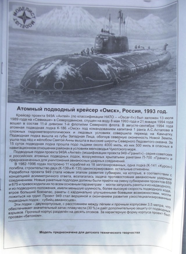 О лодке; Подводные лодки проекта 949А "Антей" (модификация проекта 949 "Гранит")-серия советских и Российских атомных подводных лодок, вооружённых крылатыми ракетами П-700 "Гранит" и предназначенных для уничтожения авианосных ударных соединений. Проект 949 стал вершиной и окончанием развития узкоспециализированных подводных лодок-"убийц авианосцев".