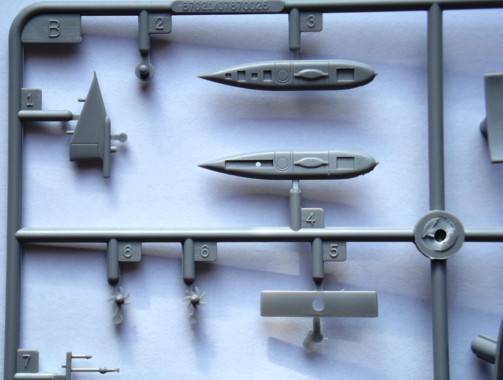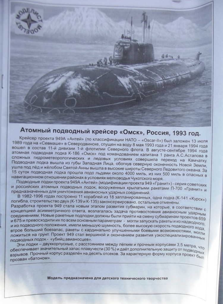 О модели; В коробке с верхней загрузкой находятся, три литника из пластика серого цвета, два из которых половинки корпуса лодки, еще один литник из пластика чёрного цвета основа подставки, каждый литник находится в отдельном запаянном пакете, чёрно-белая инструкция по сборке и окраске на русском языке на 8 страницах, и одна подложка с декалями. Литники из прочного пластика, хорошо детализированы, смещения пресс форм нет, облоя не обнаружено, половинки корпуса хорошо стыкуются. Набор предусматривает сборку АПЛ в двух вариантах, надводном положении и в подводном, декали предусматривают только АПЛ "Омск". Цена набора 310 руб. Приятного просмотра.