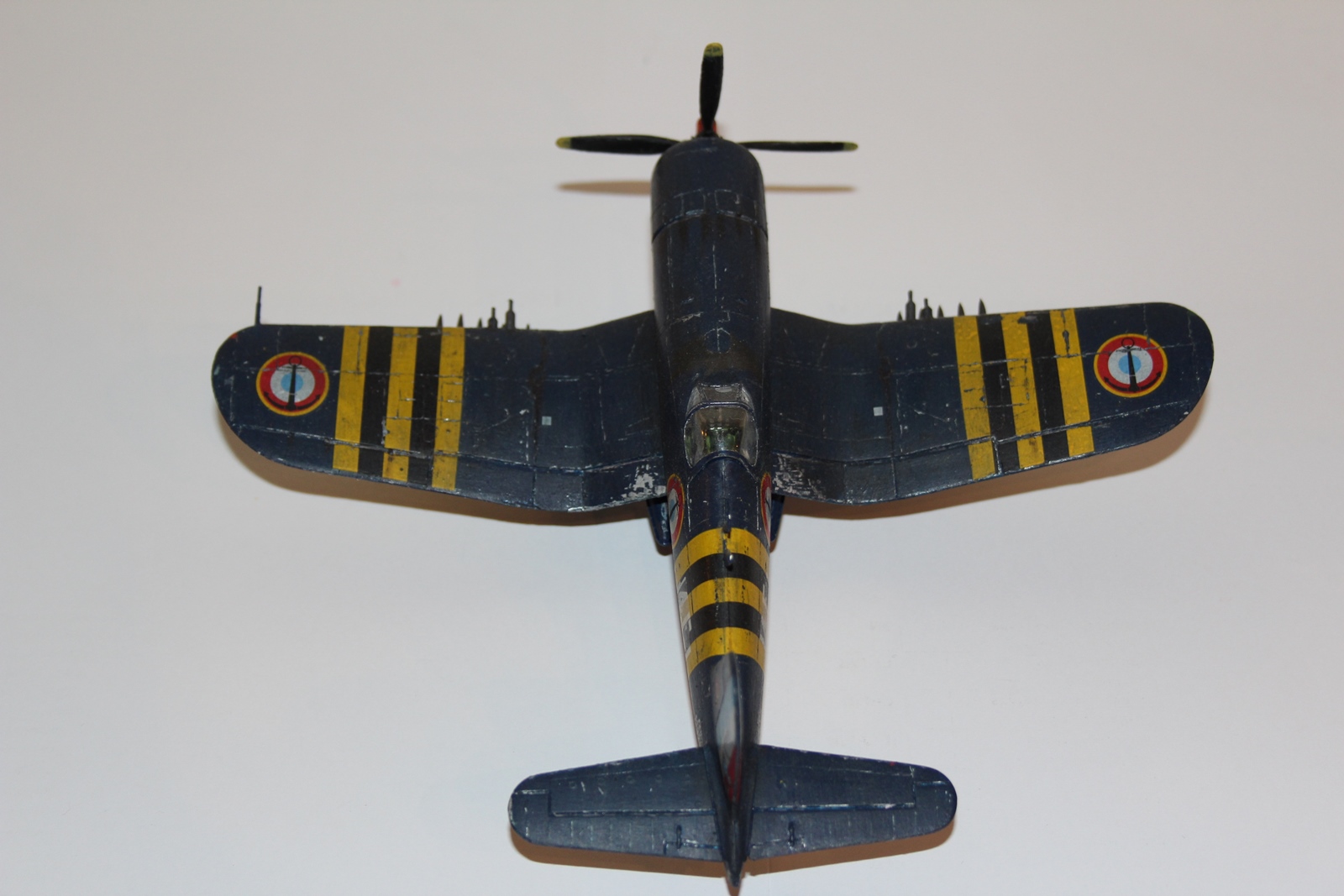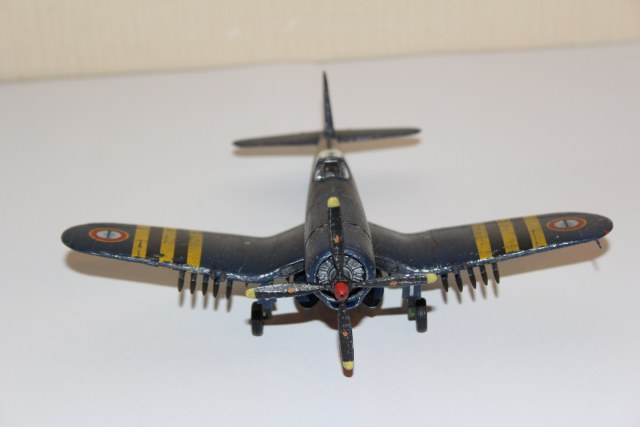 Если посмотреть на реальные корсары хоть французского флота, хоть американские периода войны на Тихом океане - увидим что это действительно очень колоритные, в своей потасканности, самолеты. Но для воспроизведения таких эффектов нужен навык и внимательное изучение фотографий реальных машин. Так что удачи в будущем. Будьте более умеренным при везеринге - тут очень легко переборщить и все испортить. Например на фото ниже обратите внимание на цвет следа от выхлопа и его многослойность и обилие оттенков.