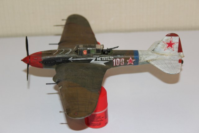 Степень загрязнения модели зашкаливает, может для начала сделать "чистенькую" модель без такого количества следов эксплуатации, это будет смотреться лучше особенно учитывая Ваш текст про 2 вылета. Поскольку экипажа нет, лучше было сделать шасси выпущенными. И может я ошибаюсь, но кажется с декалями на фюзеляже - надпись Мститель и ноты перебор.