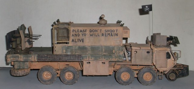 Пару лет назад, находясь под впечатлением от романа Роджера Желязны "Долина проклятий" я придумал свой постапокалиптический мир Диких Земель. Первым грузовиком (будут и другие, если вам интересно будет) стал Т.Г.П.О. (тяжёлый грузовик передового отряда). Строился он на базе италовских Ошкош и контейнера. Задача машины: доставка исследователей на точку изучения условий освоения Диких Земель. Вооружение: 40мм гранатомёт, полностью роботизированная зенитка, дымовые и слезогонные гранатомёты и личное стрелковое оружие экипажа (всё это на случай не полной зачистки территории охранными гантраками).