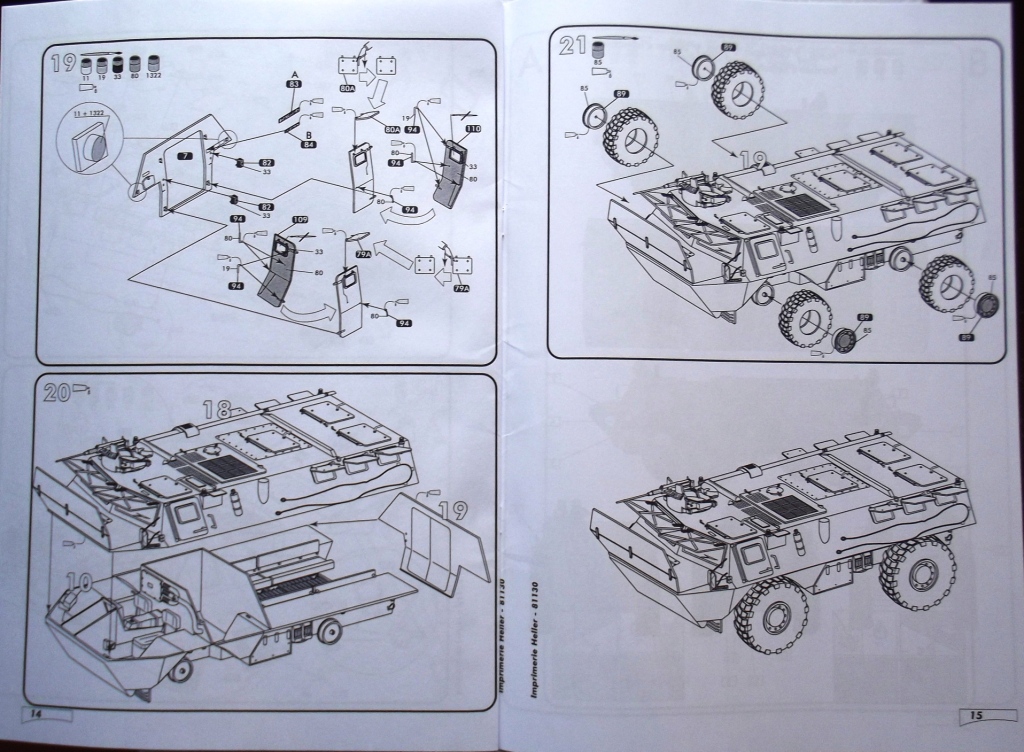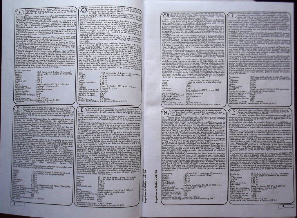 О БТР; Колесный бронетранспортер VAB, принят на вооружение в 1974 г. Выпускался в двух вариантах - с колесными формулами 4х4 и 6х6. Он имеет закрытый сварной корпус с противопульным бронированием. В бортах корпуса предусмотрены амбразуры для ведения огня из стрелкового оружия. В передней части корпуса расположено отделение управления, в средней - силовая установка, а за ней - десантное отделение. Машина имеет два комплекта шин: боевые - пулестойкие, со встроенным ячеечным наполнителем, и транспортные - низкого давления. Водные преграды БТР преодолевает на плаву с помощью двух водометов.
