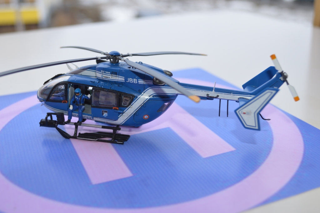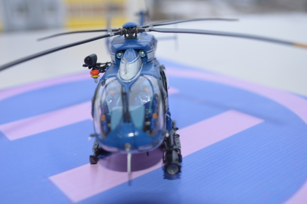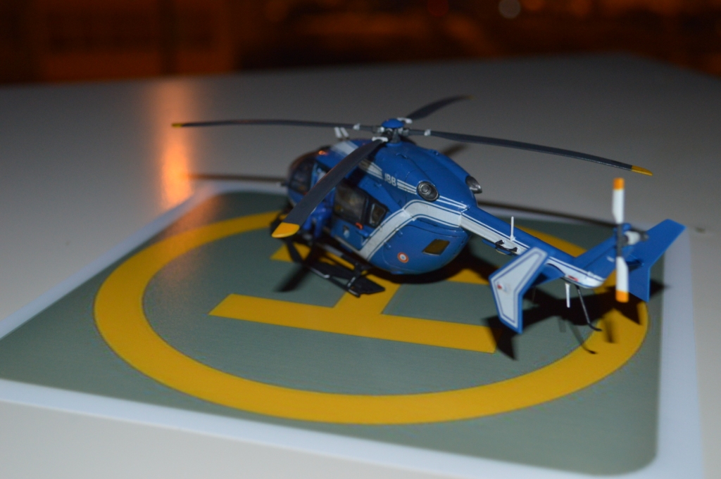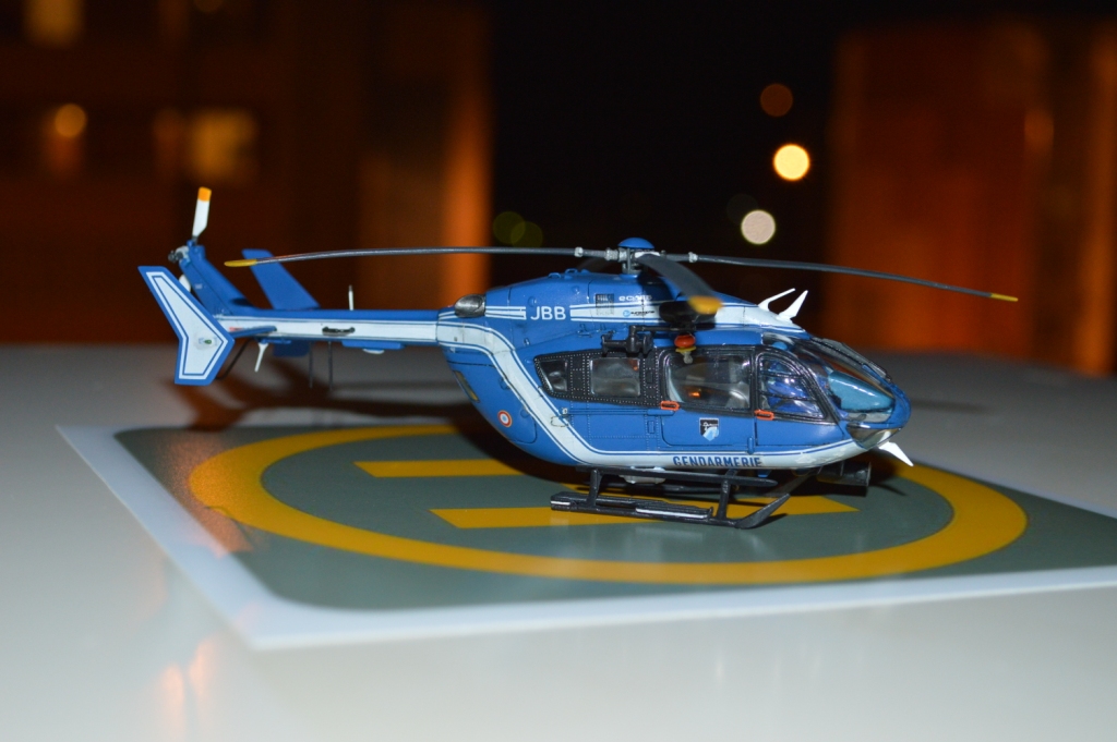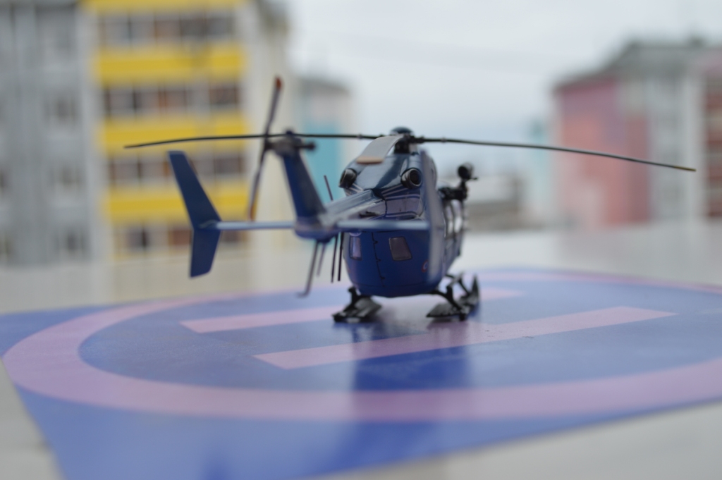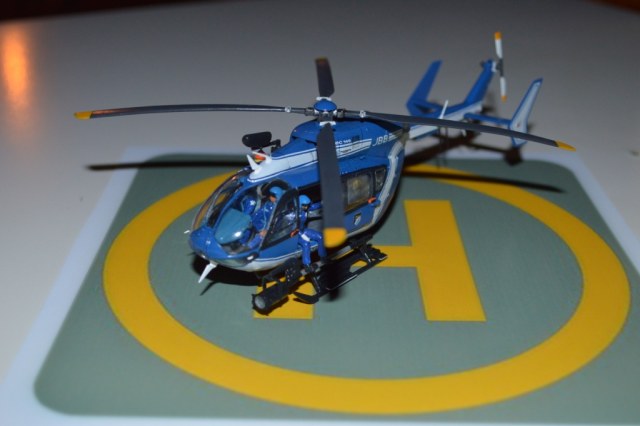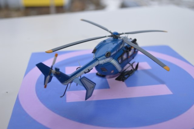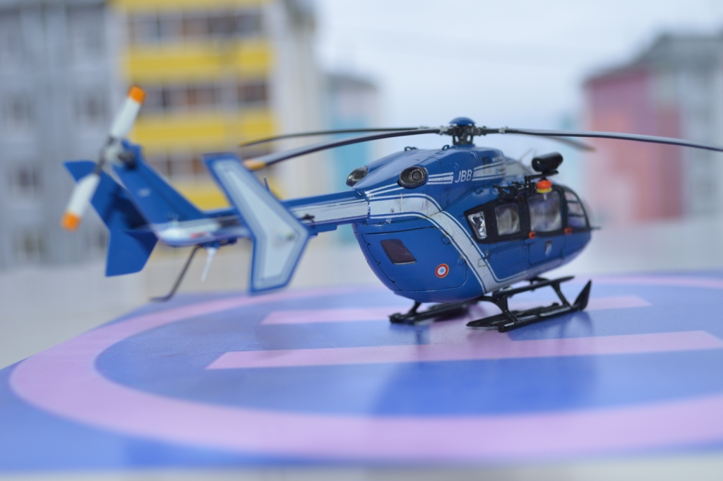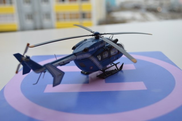 Eurocopter EC-145 от европейского производителя моделей Heller. Нужно сказать модель с высокой детализацией деталей и хорошей стыковкой. Из минусов чересчур мягкий пластик, который очень легко царапается и сложно полируется. Отдельно нужно сказать о прозрачных деталях для боковых окон: снаружи они сделаны выпуклыми, а изнутри прямыми. Т.о. получается линза, которая в целом не очень смотрится со стороны, плюс не правильно просматривается салон - как через лупу. Но главный сюрприз меня ждал ближе к концу - при размещении декалей: мало того, что инструкция хвостовой части не правильно излагала порядок нанесения, так и сами декали пришлось подгонять и урезать, что в итоге ухудшило внешний вид модели. Отдельно стоит сказать о самих декалях - очень плотные и ложатся с трудом. Фиксация также затрудняется сложным рельефом модели. Видимо нужно их как-то размягчать. В целом модель далась не легко, во многом из-за достаточно малого размера самой вертушки. Применил малость шпаклевки от Tamia. Красил аэрографом акрилом от Tamiya и Gunza. После нескольких промежуточных слоев глянцевого лака финишный полуглянцевый Tamiay. Смывка от Mig.