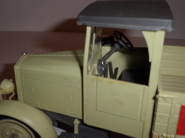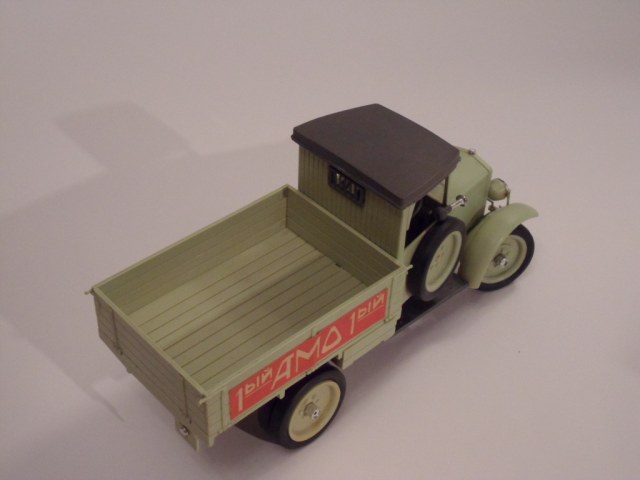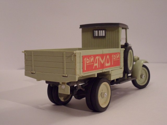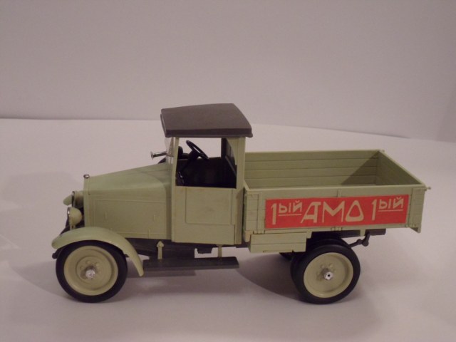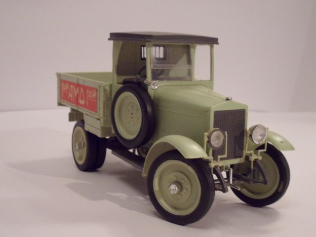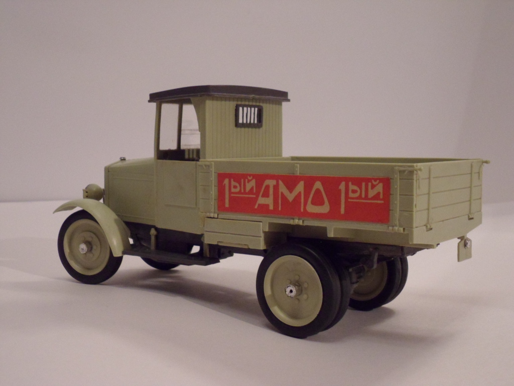 Доброго времени суток,уважаемые Каропчане! Представляю одну из первых своих сборок-коробок. Когда-то,году в 1988,наверное,этот набор произвел завод ПРОГРЕСС (коллеги каропчане напомнили,спасибо им за это!). В конце 2014-го решил я этот кит подшлифовать чуток,ибо был юн и неопытен,когда его собирал. Опыта прибавилось немного,но что смог-я исправил. Хотел сначала покрасиь-в соответствующий красный революционный цвет. Выяснилось,что даже первые 10 экземпляров,прошедших парадом по красной площади-через полгода перекрасили в защитный зеленый. Все остальные-красились в темно-зеленый изначально. К тому-же,представленный вариант-поздний выпуск,первоначально они были со складным верхом,таким образом надписи 1-ый АМО 1-ый на бортах быть не должно-это не тот автомобиль,который шел парадом. Это тот автомобиль,который был отреставрирован на ЗИЛе,скорее всего к 1987 году. Сказать-что дрова-несправедливо. Стыкуемость неплохая,для конца 80-х даже отличная. Правда копийность-не на 100%,есть огрехи,но в целом-на 4-ку. Доводить до лоска в итоге не стал-пусть останется в том времени,когда отлили.