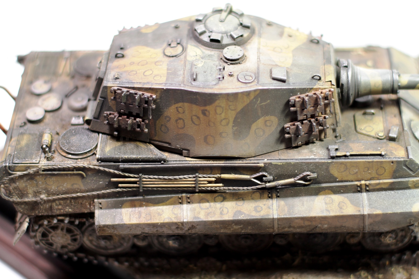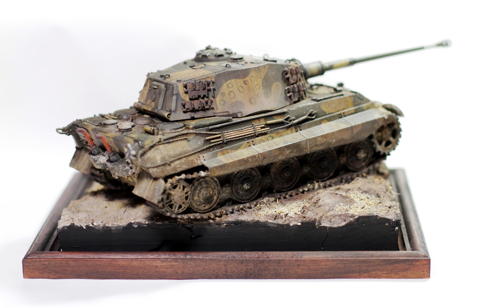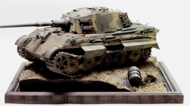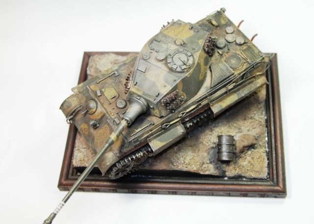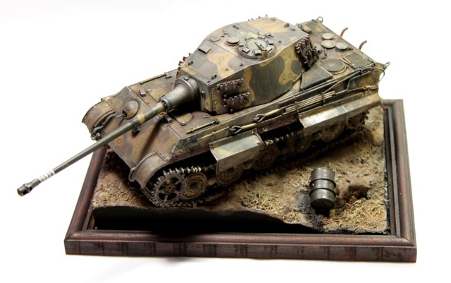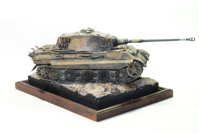 Всем привет. Представляю вашему вниманию модель «Королевского тигра». Сборка проблем не вызвала, модель очень хорошего качества. Пытался собрать на период март-апрель 1945 года. Впервые попробовал нанести камуфляж. Что из этого получилось – судить вам. Покраска тамиевским акрилом, пигменты миг, мастер пигмент и т.д. Подставка – гипс и фоторамка. Приятного просмотра.