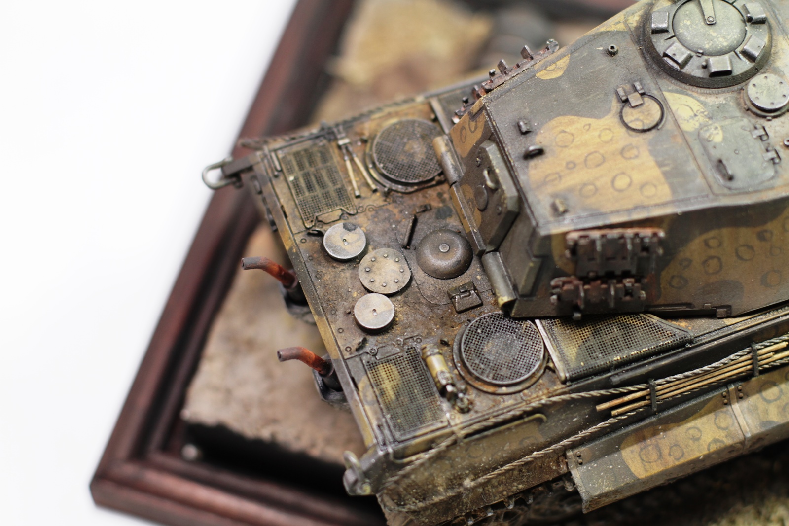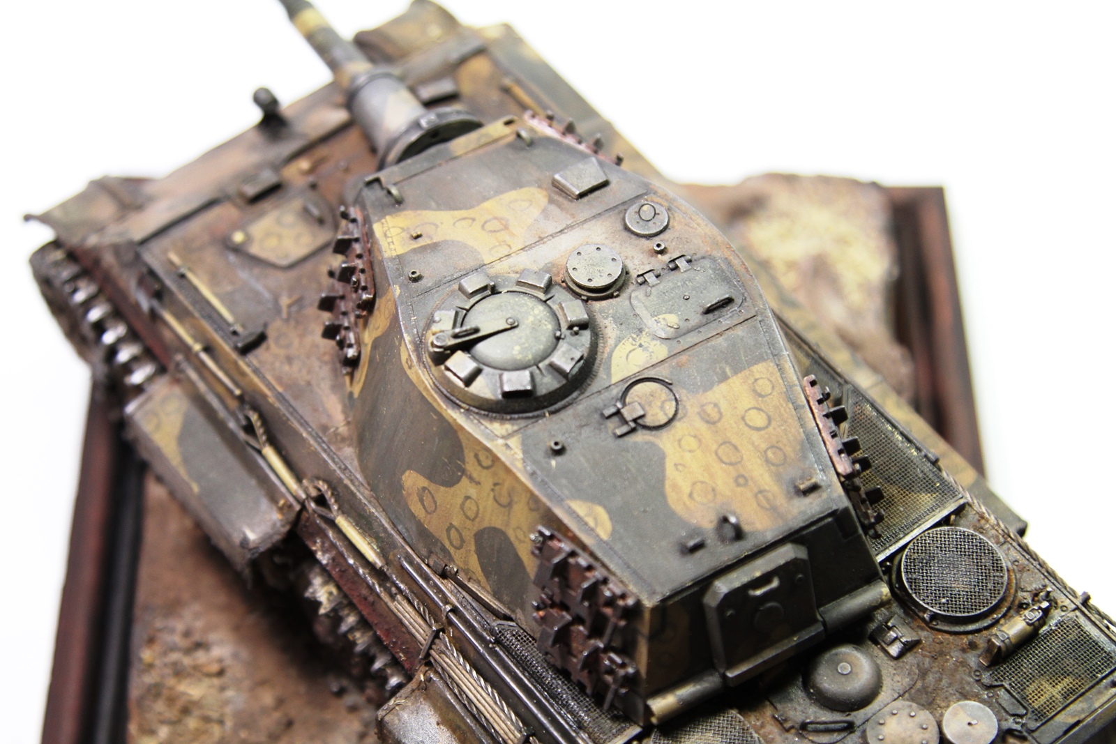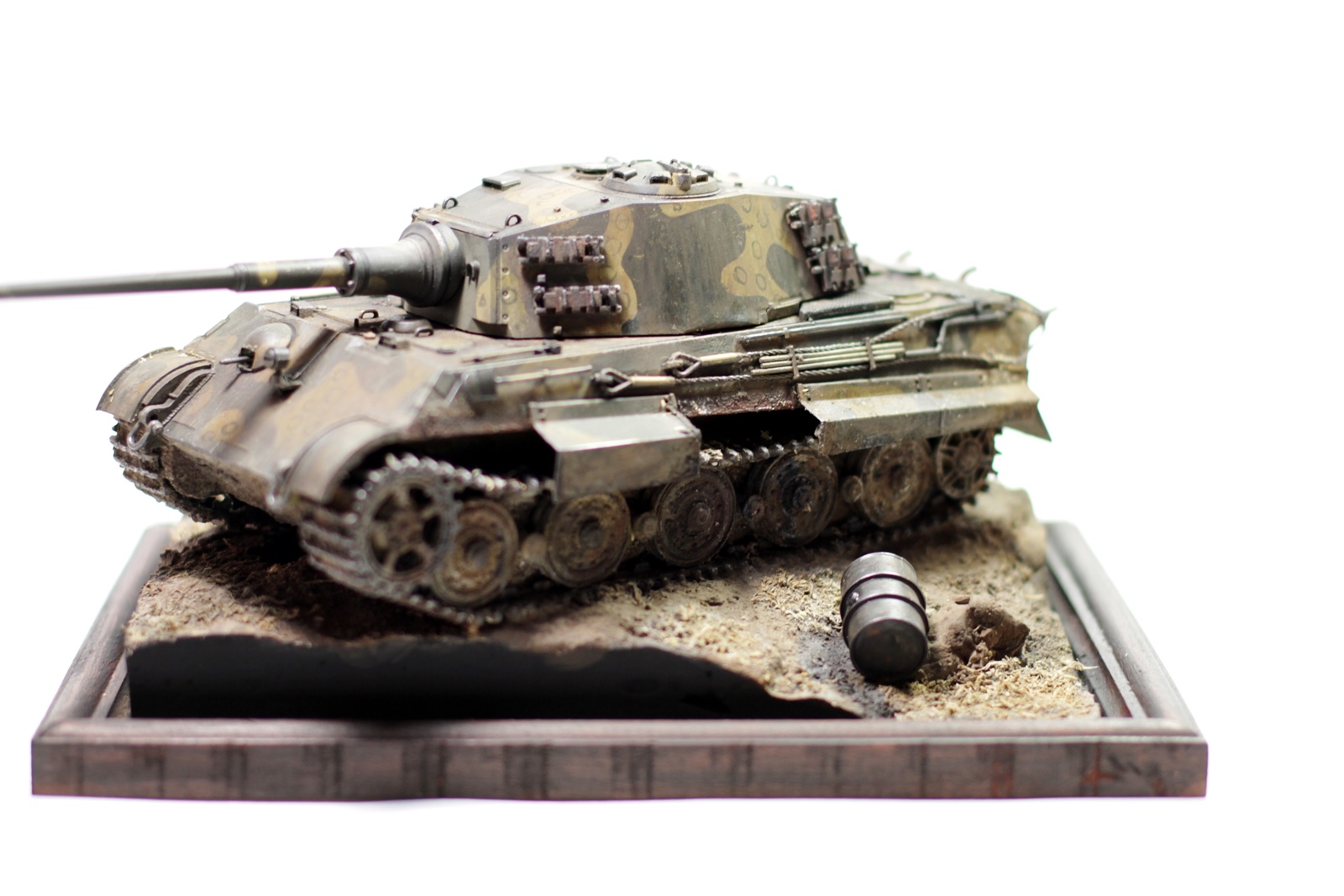Всем привет. Представляю вашему вниманию модель «Королевского тигра». Сборка проблем не вызвала, модель очень хорошего качества. Пытался собрать на период март-апрель 1945 года. Впервые попробовал нанести камуфляж. Что из этого получилось – судить вам. Покраска тамиевским акрилом, пигменты миг, мастер пигмент и т.д. Подставка – гипс и фоторамка. Приятного просмотра.