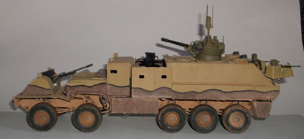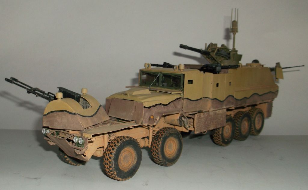 Выставляю на ваш суд вторую экспедиционную машину. Назначение этого агрегата - охрана конвоя и зачистка исследуемой территории от нежелательного элемента. Базой послужило шасси МАН 8х8 (Ревелл), была добавлена пятая ось для уменьшения нагрузки. Боевое отделение состоит из корпуса М163А1 "Вулкан" и двух площадок. На передней установлены два "Минигана" 7,62мм (смола Легенд), на задней два дистанционных "Браунинга" 12,7мм. В передней части машины находится управляемая из кабины водителя (М923 Италери) ЗУ-23-2 (Восточный Экспресс) с ленточным питанием. Гантрак так же оснащен разнообразными датчиками, облегчающими патрульно-караульную службу. Покраска кистью. Использовались эмали и акрил Тамия, Звезда и Модель Мастер. Тонировка (обгадинг) из натурпродуктов (глина разных оттенков, пыль и грязь, соскобленная с машины). Всё это касается и остальных машин.