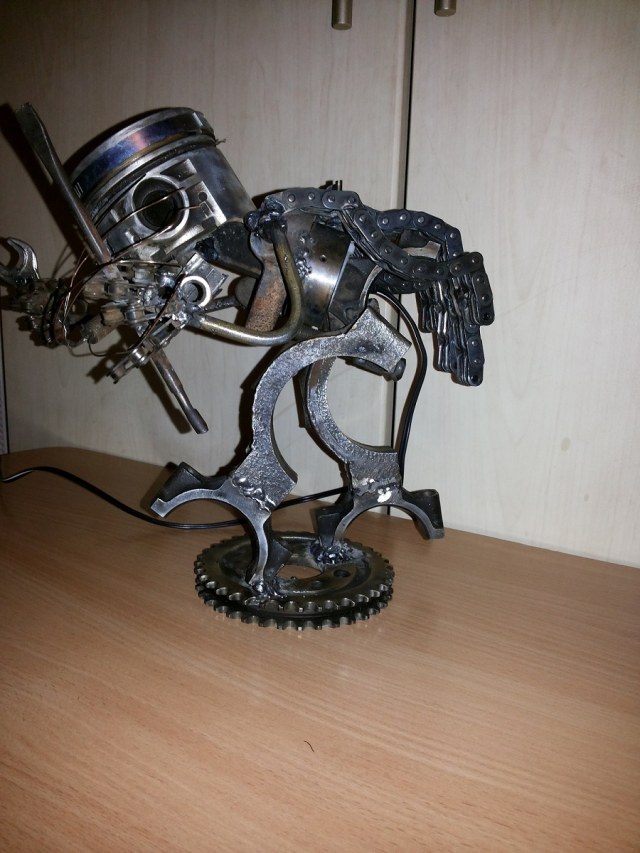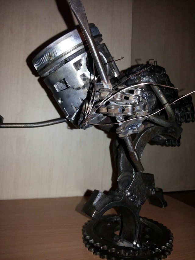 Доброго времени суток! В общем дело было так, на просторах увидел фигурки из поршней , вот и решил сам попробывать что-то в этом духе! Использовал пару поршней от "вазика" (второй нижняя челюсть) с шатунами , бугеля коленвала и шатуна,звездочку распредвала(вазик),цепи моторные и велосипедные ,сломанные ключ и отвертку ,ну и так по мелочи. Все склеено на дуговую сварку и зачищено "ерщиком" на болгарке. В самом конце в поршень установил пару диодов. Фотографировал как смог ))))
