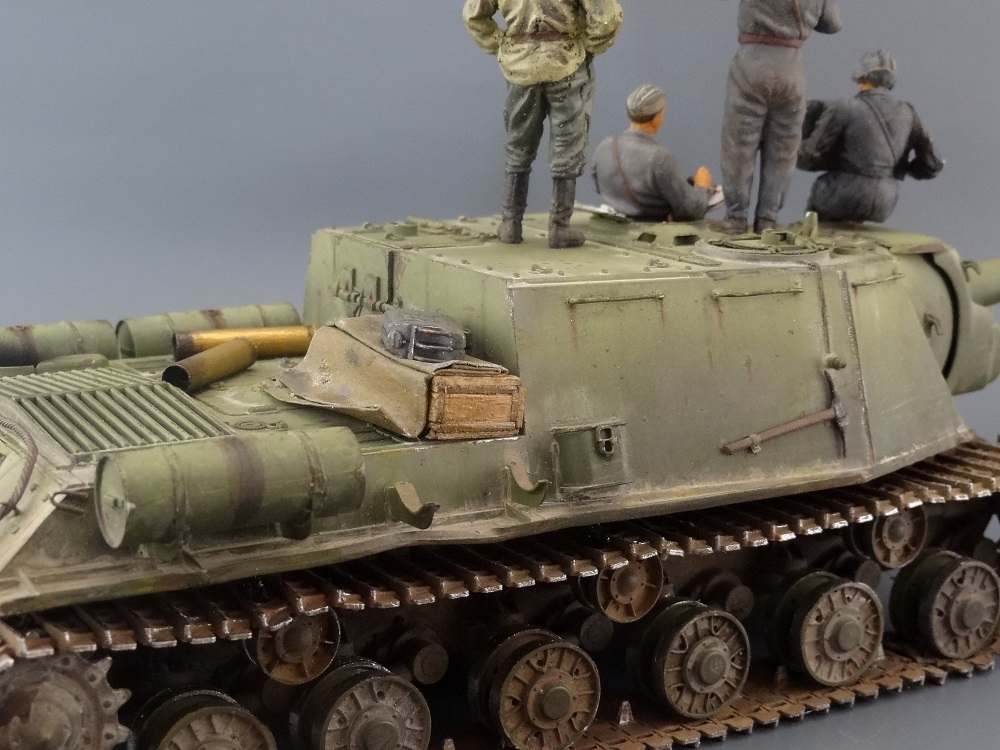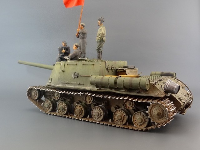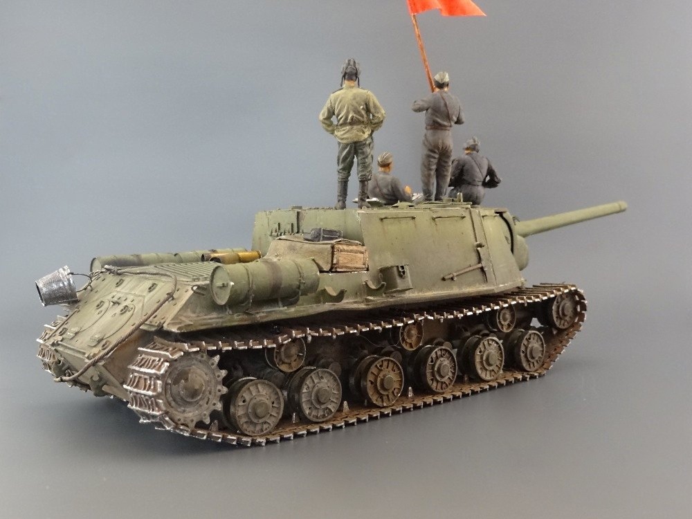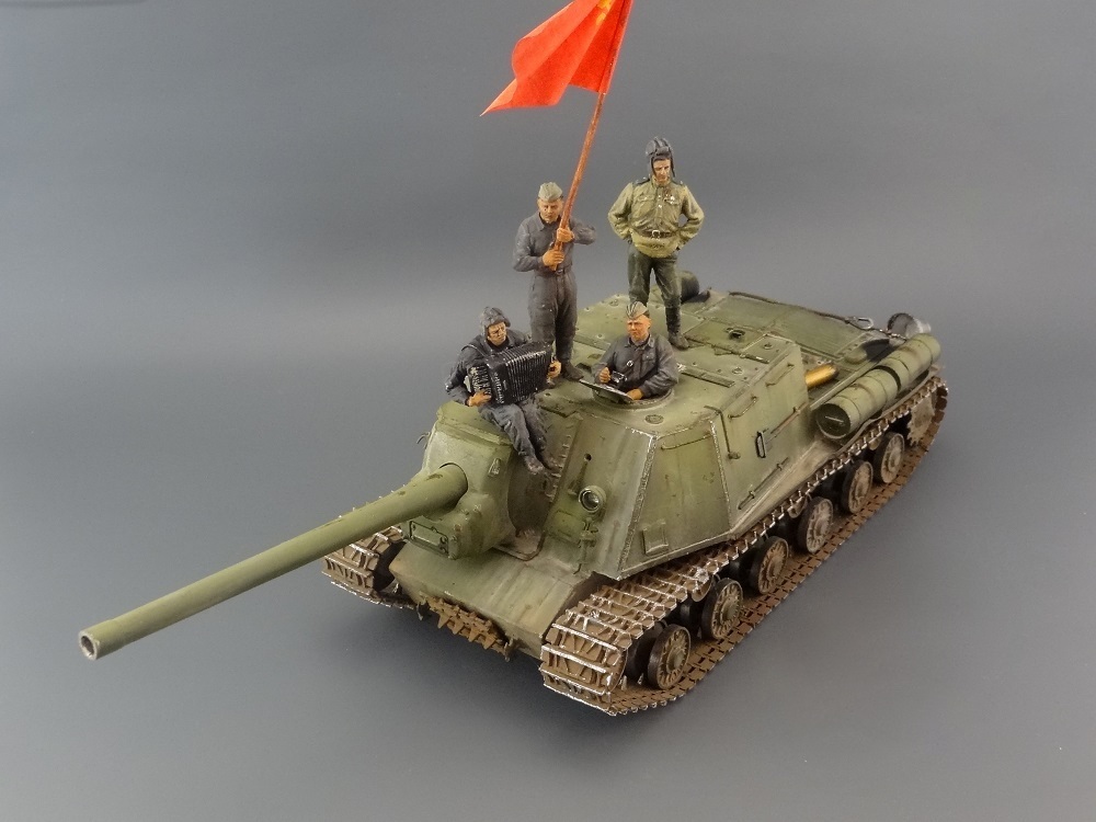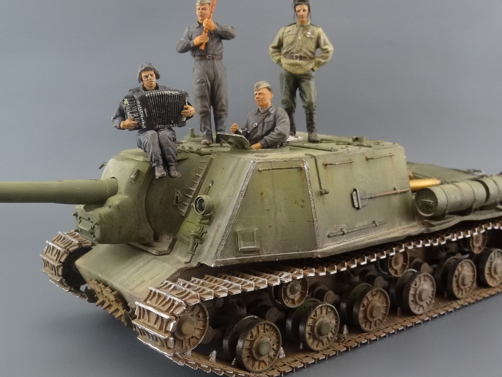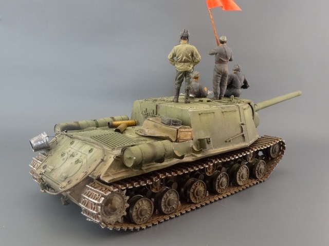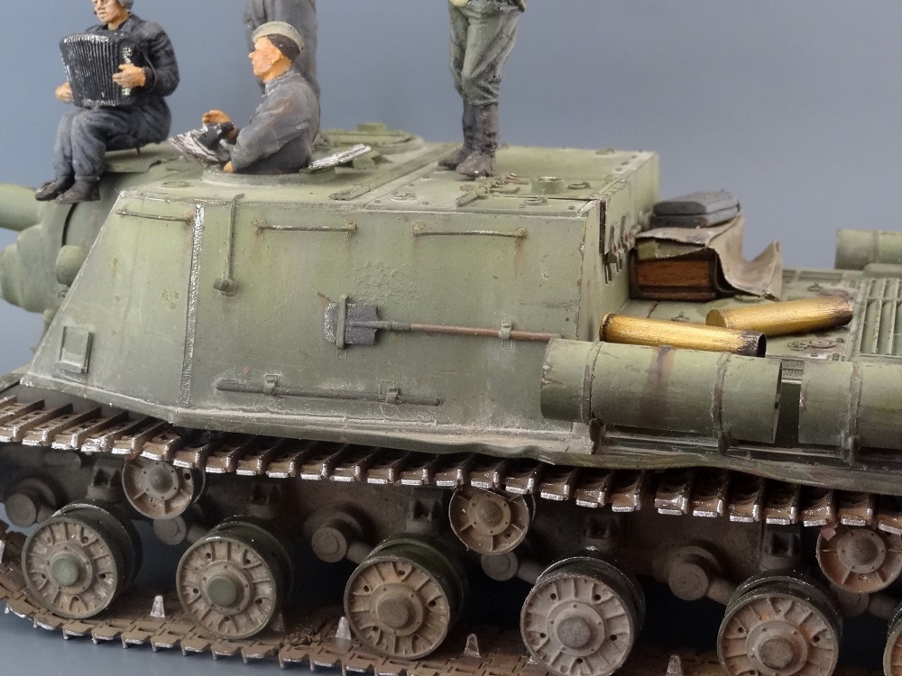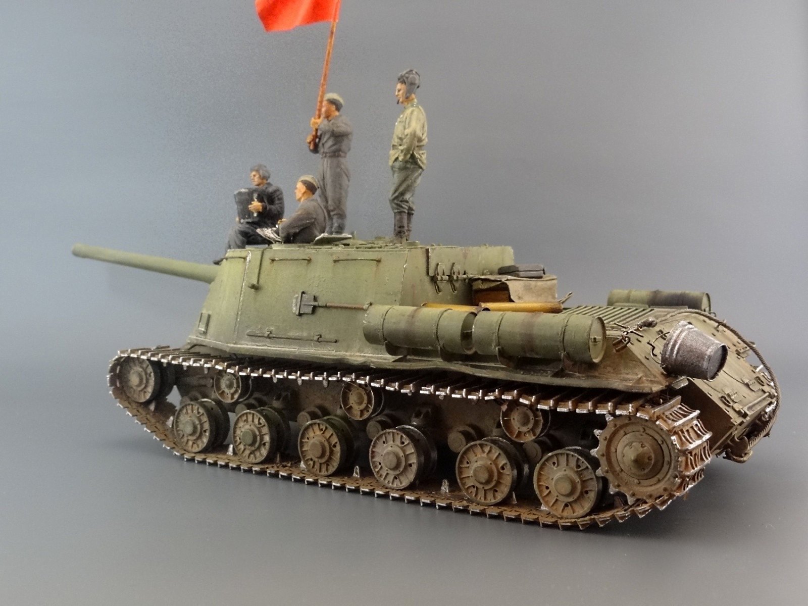 Доброго времени суток коллеги. Разрешите представить вам свою работу ИСУ-122. Собрано из "коробки" Из переделок только поручни из проволоки и хомуты крепления баков. Покраска акрил от Тамии. Пыль и следы эксплуатации пигменты масло