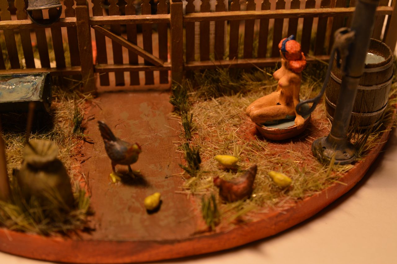 Тётка (которая в тазике моется) при всей своей "чистоплотности" (не вытерпела и средь бела дня под забором, и под холодной водой колонки стала мыться), всё же та ещё "свинтус", моется во дворе на улице, в окружении сена (и вполне вероятно всяких фекалий))), пыли и домашних животных !
