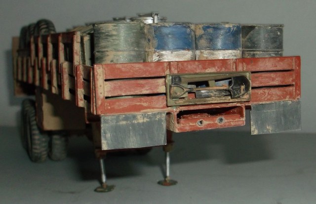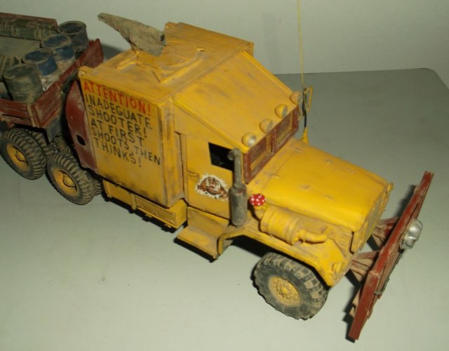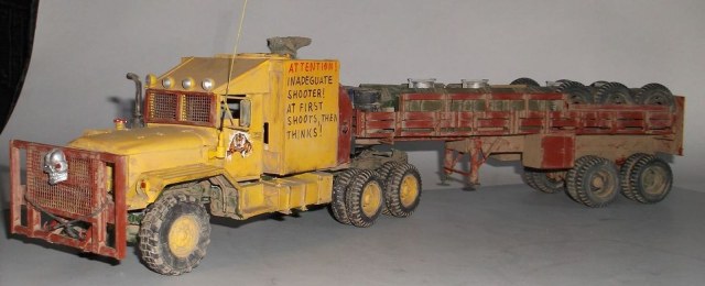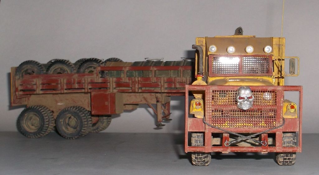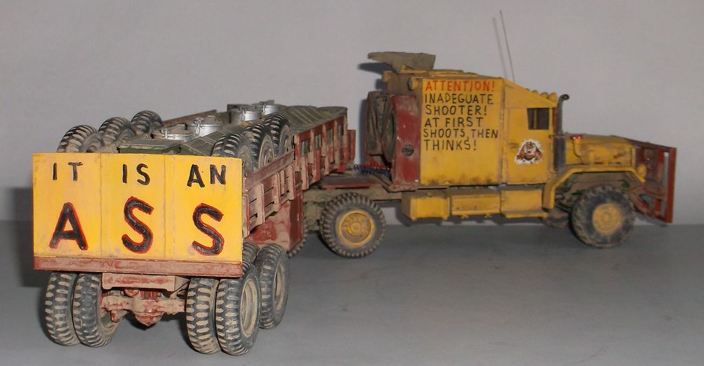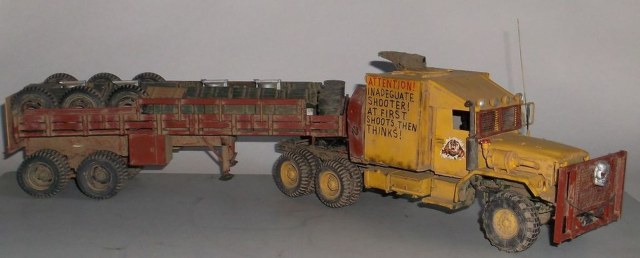 Вот и дошла очередь до тягача в духе "Безумного Макса"! Я не претендую на похожесть, просто вдохновил фильм. За основу был взят М925 (Италери), конверсионный набор М54 (кабина, морда и задние колёса смола Реал Моделс), передние колёса (смола ДЕФ Моделс). Для установки "спального отсека" была удлинена ходовая (как на реальном автомобиле, забыл его индекс) и поставлено седельно-сцепное устройство. Передний слоноотбойник скопирован с М923 "Hillbilly" (Италери). На крыше спальника установлен оборонительный пулемёт кал. 7,62мм. Цистерна сделана из двух цистерн GMC-352 (Италери) и куска рамы с балансирной тележкой от М925. Это, наверное, самая главная машина в конвое. Она идёт в середине колонны и хорошо охраняется.