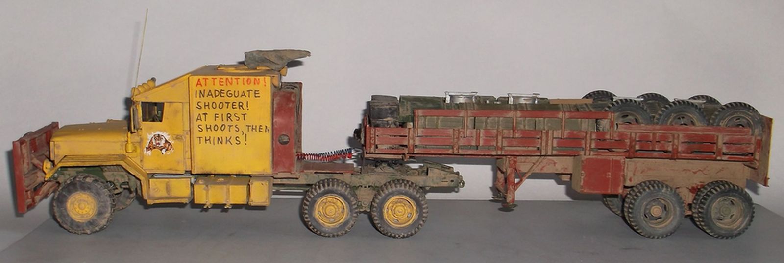 Надпись на тягаче корявая: во-первых, должно быть inadequate, если имеется ввиду неадекватный стрелок. Но в английском языке это очень сильное негативное определение, про себя так никто не напишет, даже в приступе самокритичности. Это примерно то же самое, что на своей машине написать "пи**рас за рулем". И сама фраза построена по-русски, правильнее было бы "shoots before thinking".