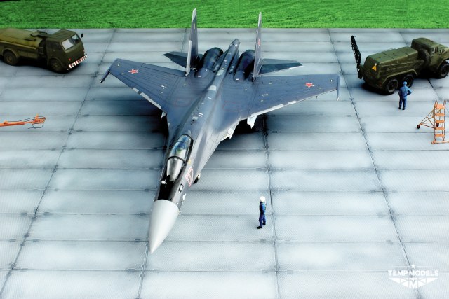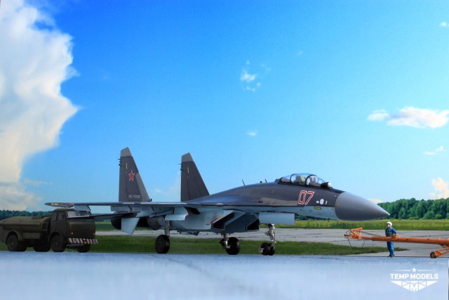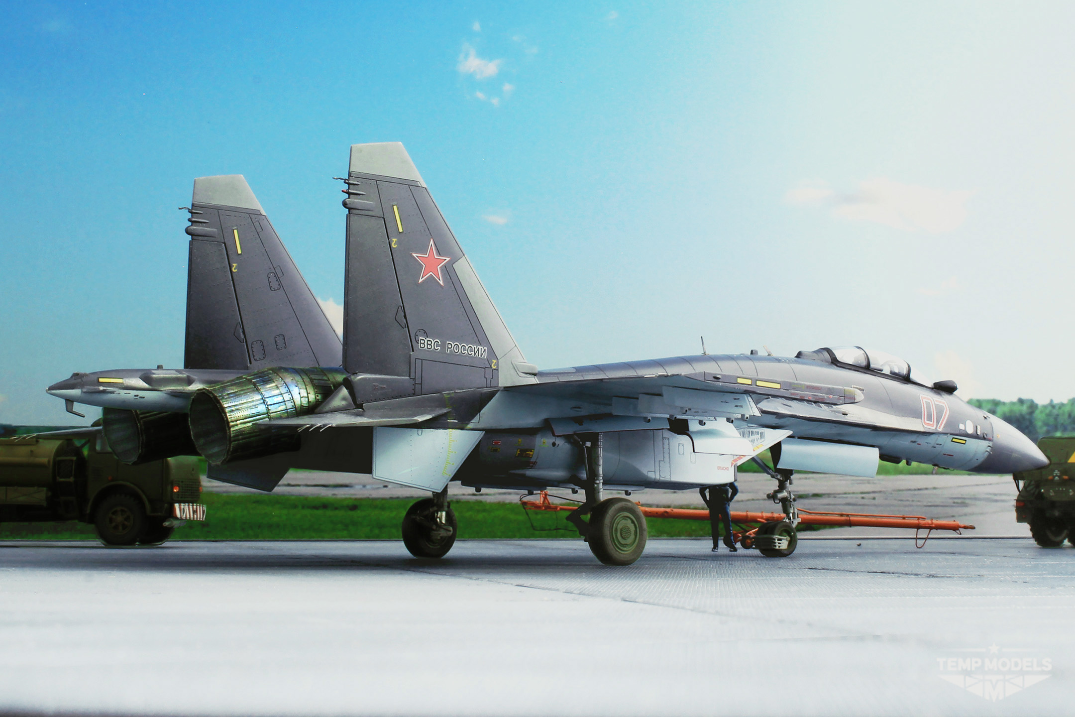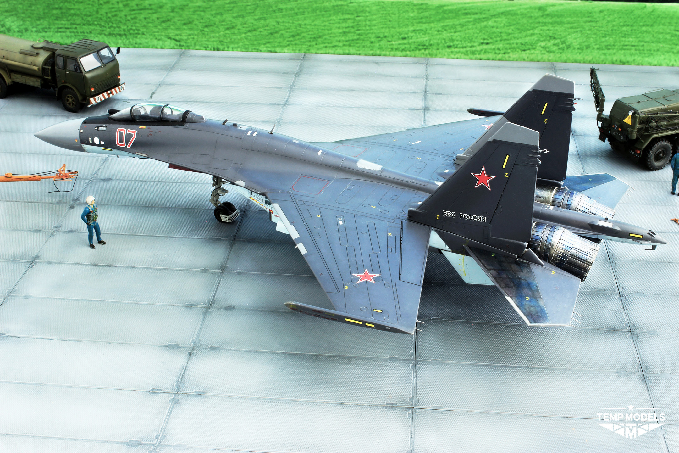 Основными вызовами в этой модели была имитация побежалости на двигателях, уж очень она на су-35 интересная, а также поверхностей задних стабилизаторов, предназначенных для защиты планера при пуске ракет, у них тоже сложный рисунок. Упрощать побежалости не хотелось - делал все по фотографиям, пытаясь максимально повторить оригинальный вид. Что получилось - судить вам, я лично остался доволен.