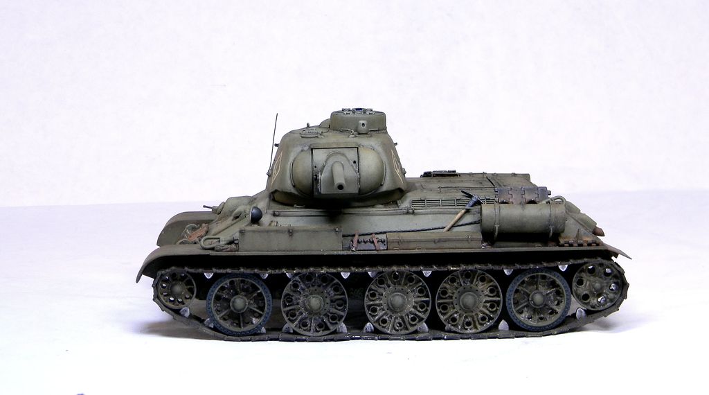Добрый день Каропчане!Очередная моя работа,на сей раз Т-34/76 от Драгона.Сборка по большей степени изкоробка,от себя-проводка к фаре и сигналу,траки мастерклуб,ну и добавил из остатков от других наборов-доп.баки,чтобы модель не смотрелась пустой.Военных фото этой модификации 34-ки с таким расположением катков увы не нашёл,только фотографии памятника этого танка,находящегося в Карелии.Красил модель акрилом Тамии,с последующей тонировкой масл.красками и пигментами миг.С уважением!